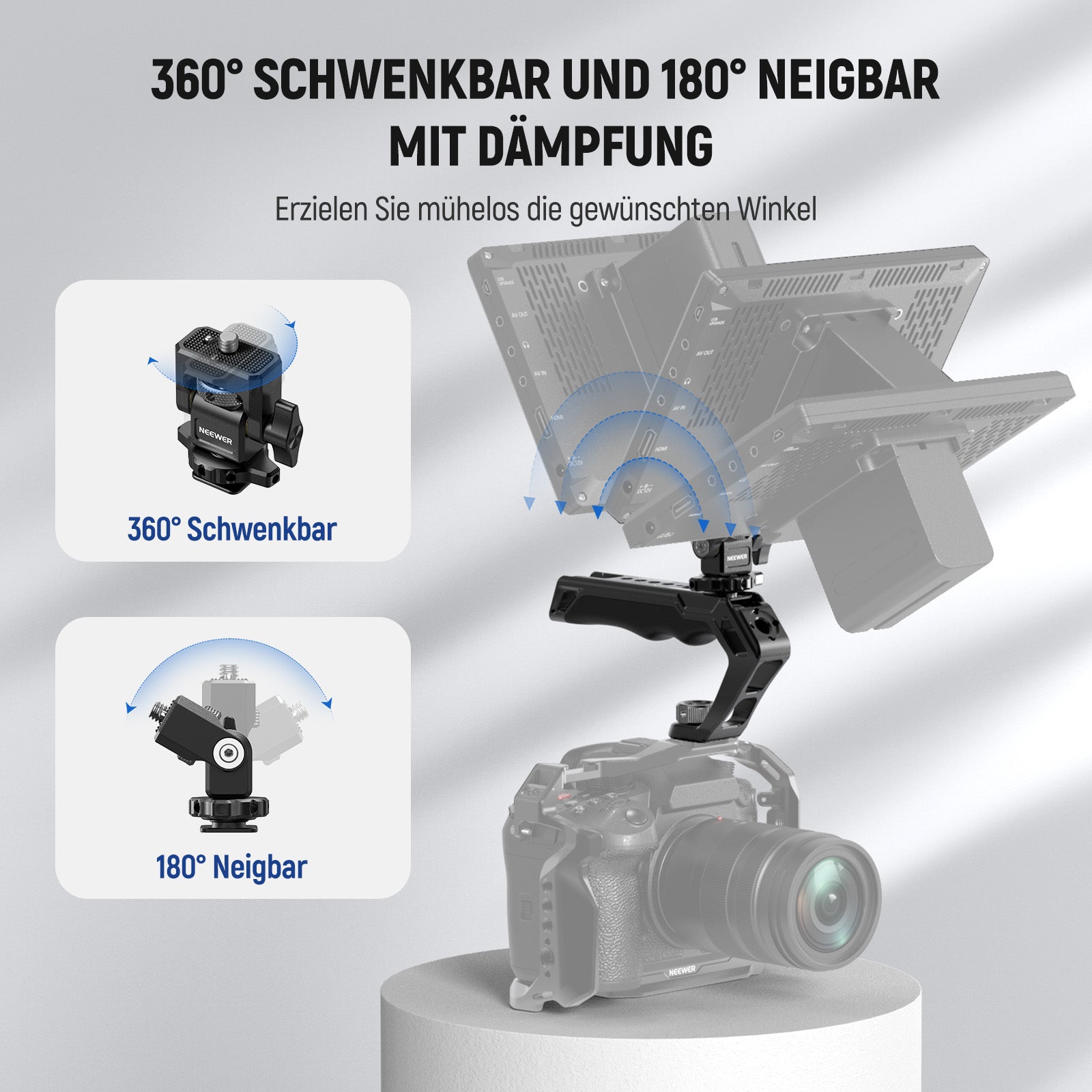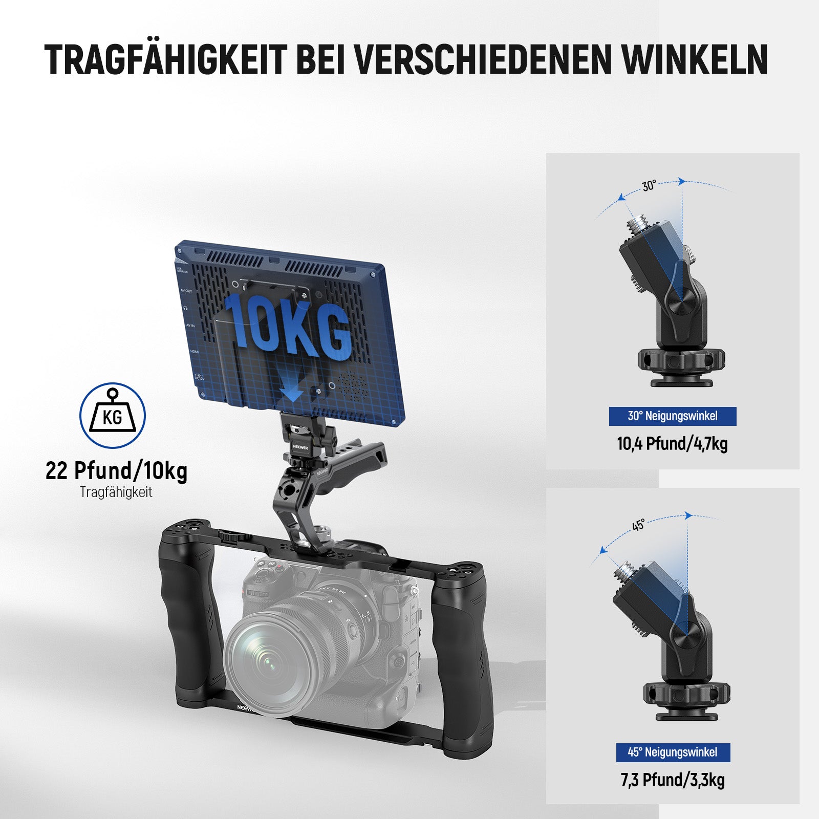 - Oberer Griff & Monitorhalterung- Der obere Griff kann über eine 3/8-Zoll-Schraube mit ARRI-Positionierungsstift fest am Käfig befestigt werden und verfügt über einen geformten Silikongriff für stabile manuelle Aufnahmen. Die Monitorhalterung ist kompatibel mit Atomos Ninja V und anderen 5-7-Zoll-Monitoren mit 1/4-Zoll-Gewinde und lässt sich über einen Schieber mit dem Griff verbinden und bietet eine 360-Grad-Drehung und eine 180-Grad-Neigung, um den gewünschten Winkel zu erreichen.