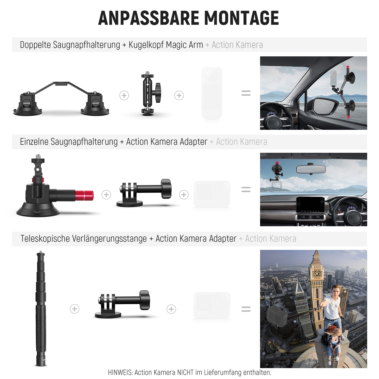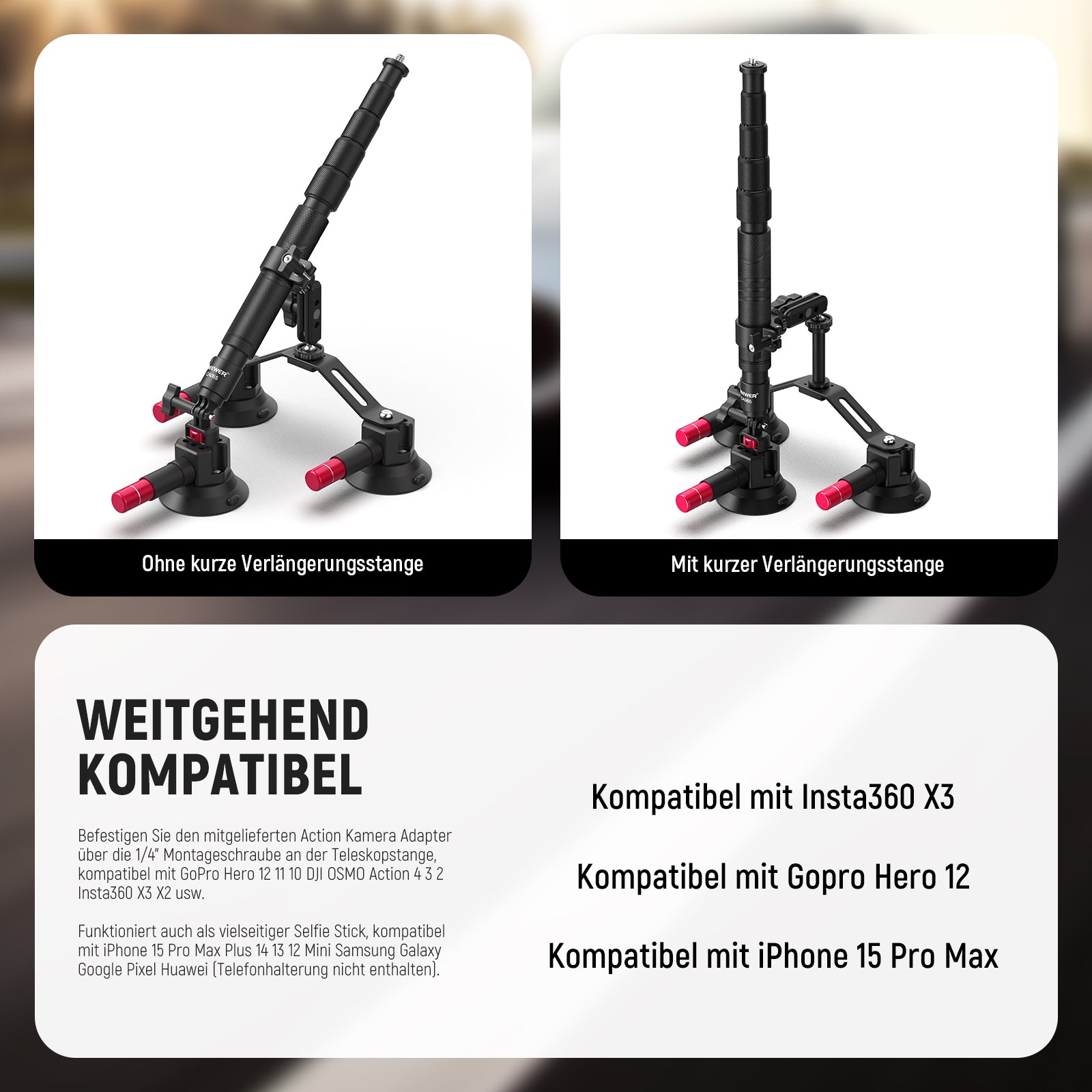 - 【Inklusive Action Kamera Adapter】 Die einzelne Saugnapfhalterung, die Teleskopstange und die kurze Verlängerungsstange sind alle mit einer 1/4" Montageschraube für die vielseitige Montage von spiegellosen Vlog Kameras, Camcordern, Telefonhaltern, Action Kamera Adaptern und mehr ausgestattet ( nur der Action Kamera Adapter ist im Lieferumfang enthalten. Der Action Kamera Adapter ist kompatibel mit DJI OSMO 360 Action 6 5 Pro 4, GoPro 13 Hero13 Hero 12 11 10 9 Black Go Pro Max, Insta360 X5 X4 X3 X2 und mehr