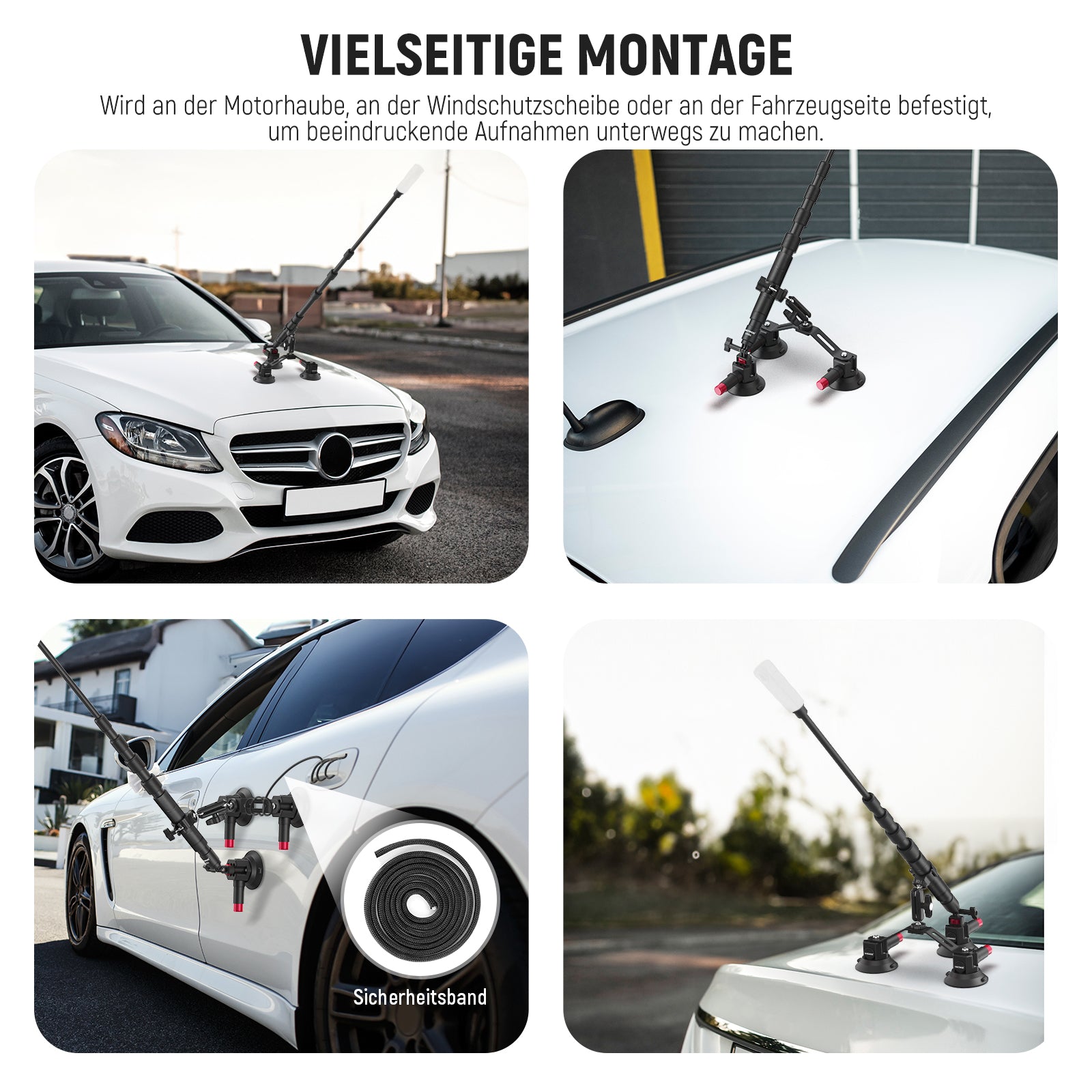 - 【Dreifacher Saugnapf Autohalterungssatz】 Erfassen Sie beeindruckende POV Aufnahmen (Point of View) aus einzigartigen Blickwinkeln wie der Motorhaube, der Windschutzscheibe innen/außen, dem Armaturenbrett oder der Fahrzeugseite. Der Saugnapf-Kamerahalter befestigt Ihre Action Kamera sicher mit drei leistungsstarken Saugnäpfen und ermöglicht eine flexible Positionierung mit Verlängerungsstangen und einem magischen Kugelkopfarm für Videoaufnahmen, mit einem Sicherheitsband für zusätzliche Sicherheit. Hinweis zur Verwendung bei Geschwindigkeiten unter 80 km/h, um versehentliche Stürze zu vermeiden