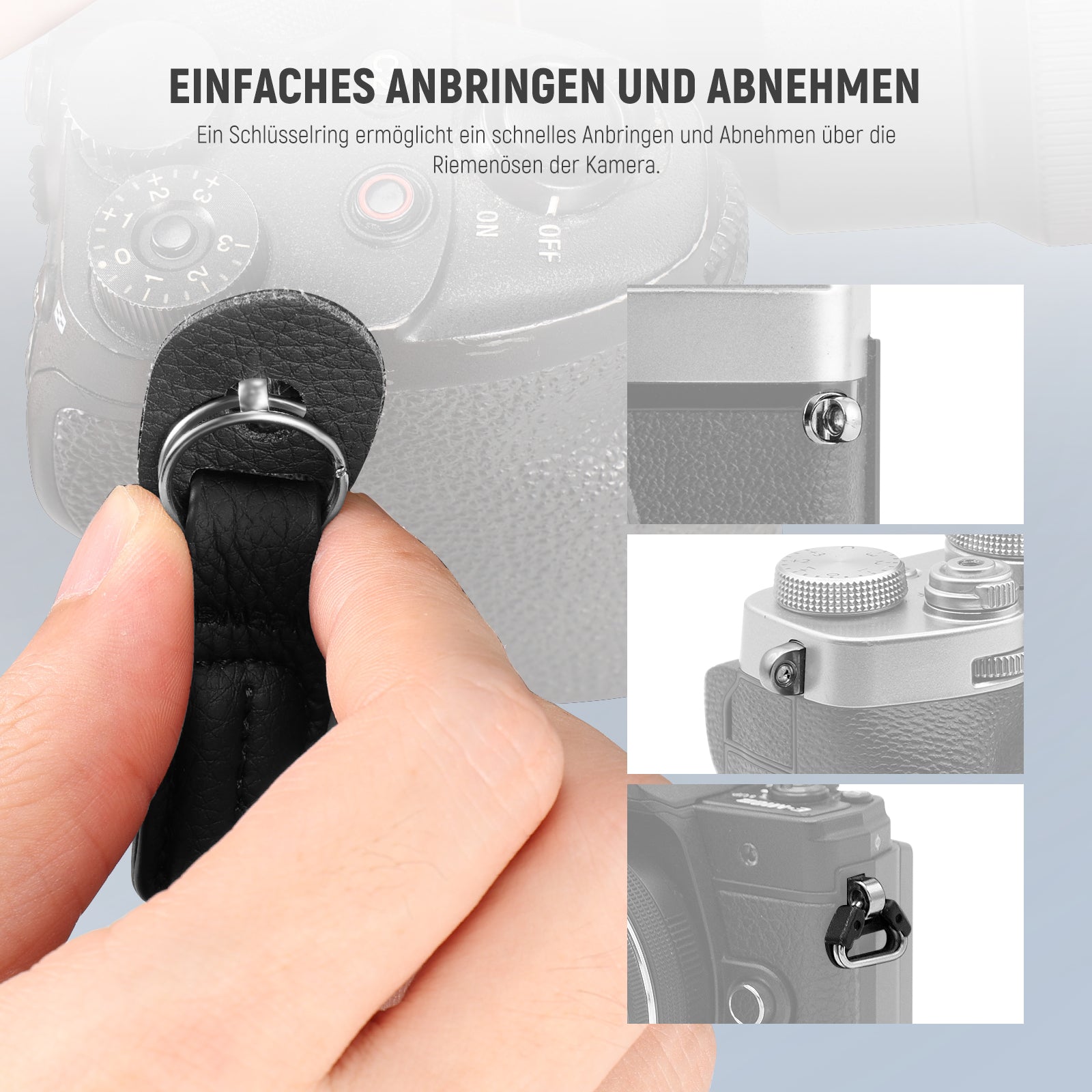 - Einfach zu installieren und zu entfernen- Der Schlüsselring kann schnell durch das Loch im Handgelenk Trageband angebracht und entfernt werden
