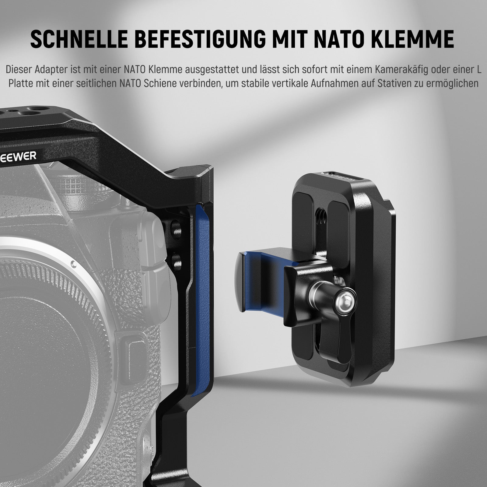 Finden Sie andere NEEWER Produkte- Diese Adapterhalterung kann mit den meisten NEEWER Stativköpfen kombiniert werden, einschließlich GM27 Fluidkopf, GM36 Niedrigprofil Schwenkkopf, SR015 15mm LWS Grundplatte und Kamerakäfigen mit integriertem NATO Schienen, wie CA031 für EOS R50, CA041 für Z8, CA025 für ZV-E1 und CA055 für Lumix GH6