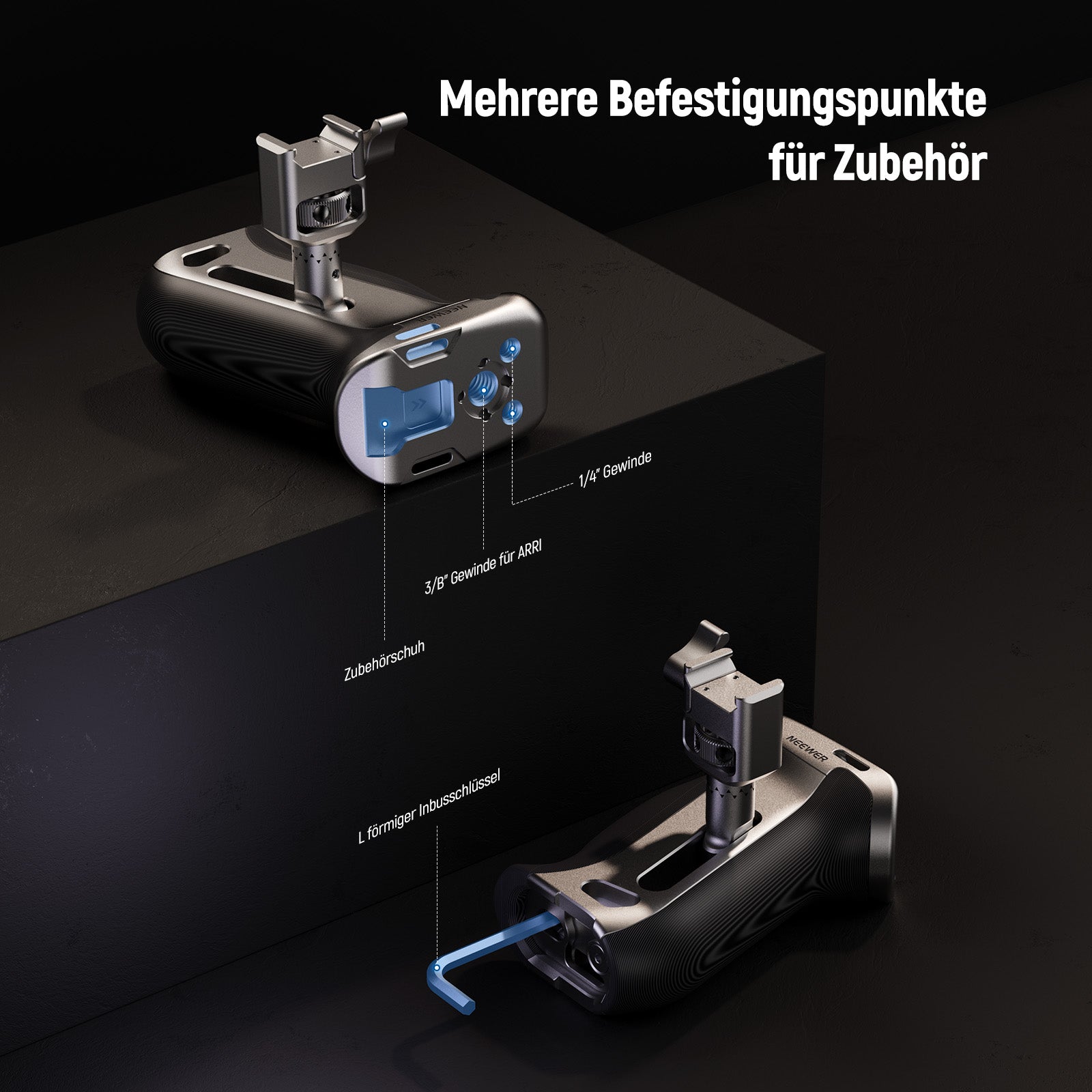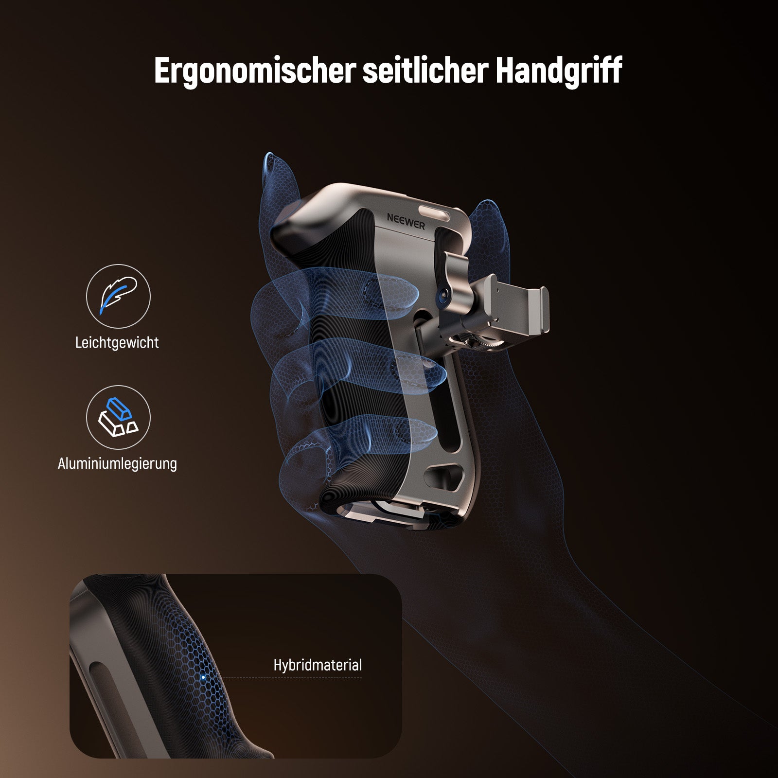 - Mehrere Befestigungspunkte für Zubehör- Mit zwei 1/4" Gewinden, einem 3/8" Gewinde zur Ortung, einem Zubehörschuh und vier Handschlaufenschlitzen kann der Seitengriff zur Funktionserweiterung das NEEWER RGB62 LED Videolicht, das CM14 PRO Mikrofon, die MA006 Monitorhalterung und die CA090 Kamera Handschlaufe anschließen