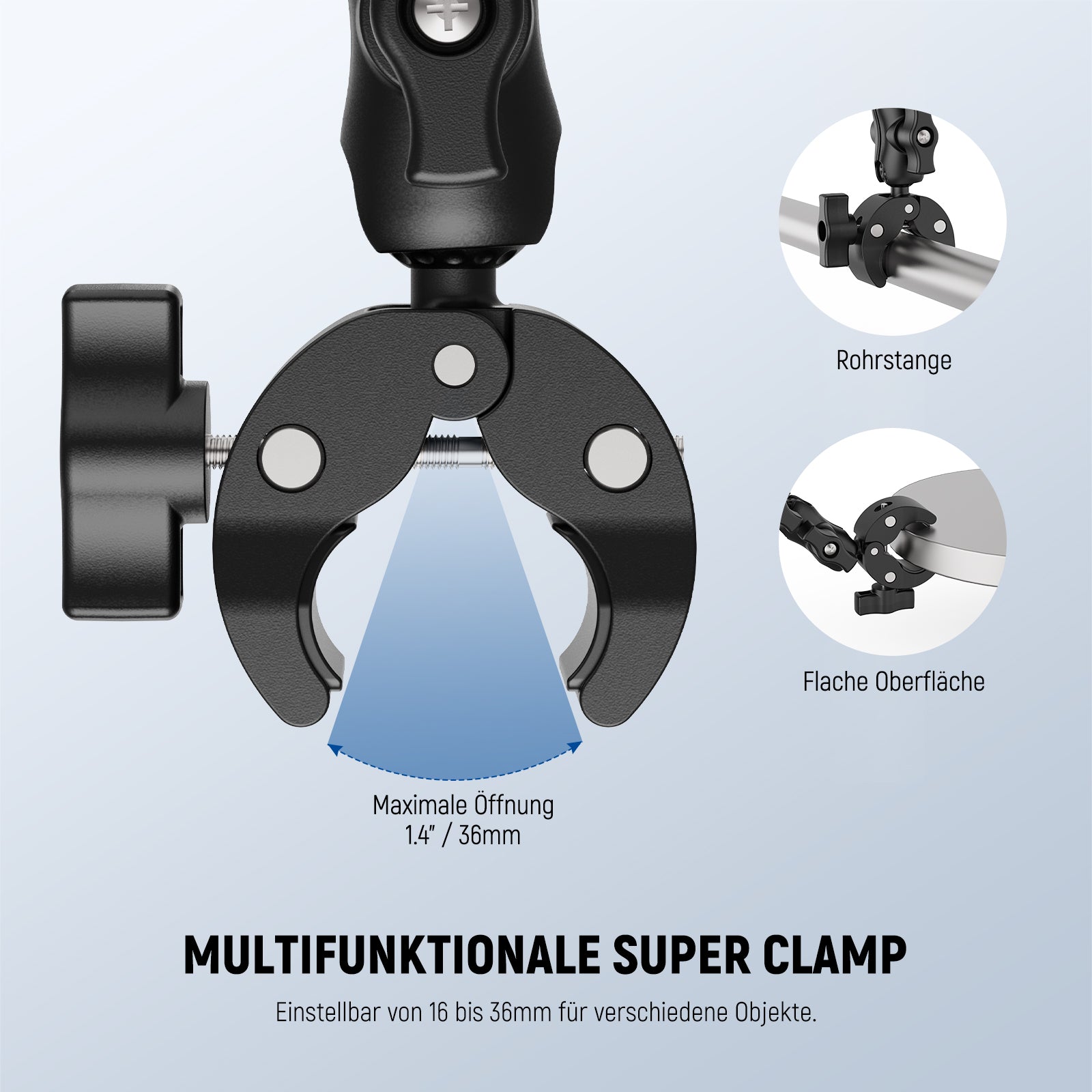 - 360° Doppelkugelköpfe- Die verstellbare C Klemme verfügt über eine 360° Drehung und eine 180° Neigung an beiden Enden und ist mit einem Handfeststellknopf für eine einfache Bedienung ausgestattet. Hinweis: Der Magic Arm und die Super Clamp Halterungen können nicht abgenommen werden