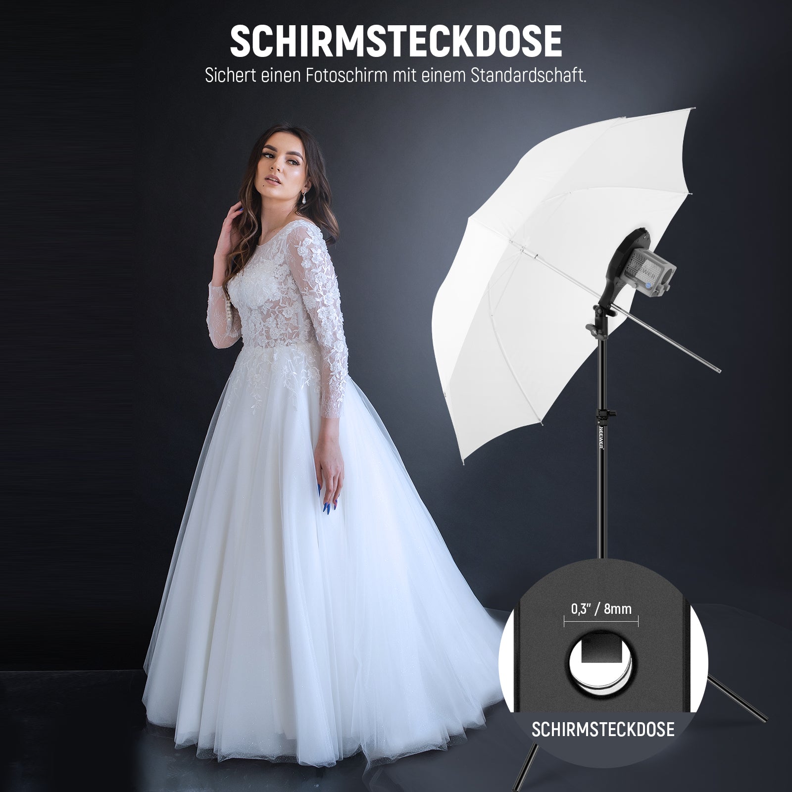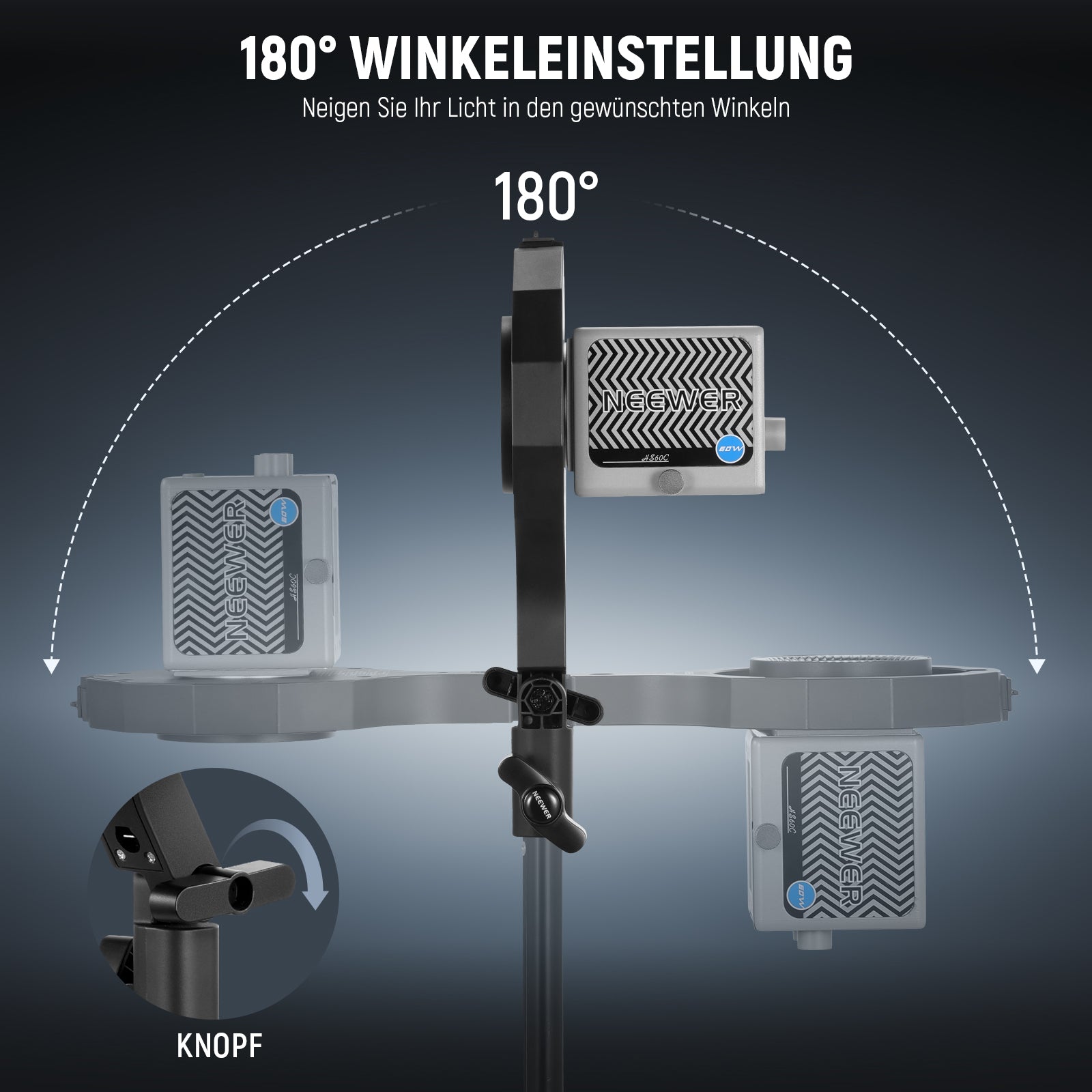 - 5/8" Adapter für die Montage von Lichtstativen- Der 5/8" Empfänger mit Feststellknopf kann sicher an den meisten Lichtstativen befestigt werden und ermöglicht eine Neigung von 180° für eine flexible Winkeleinstellung