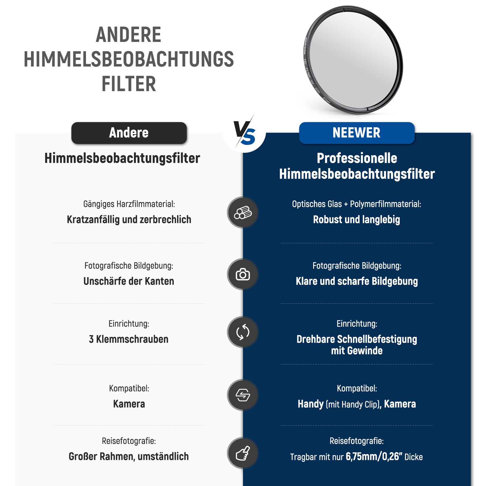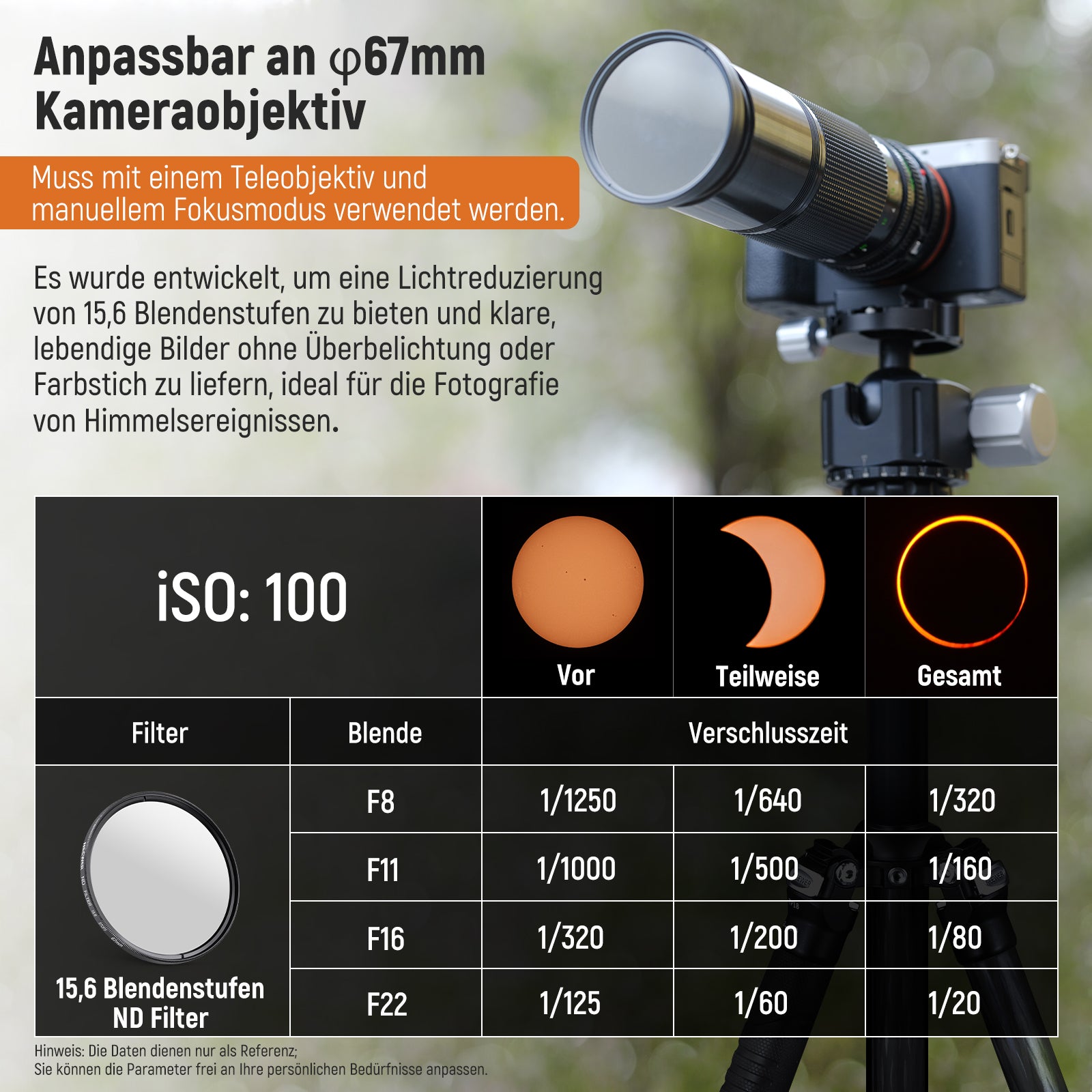 - Für atemberaubende himmlische Aufnahmen- Unser Neutraldichtefilter mit einer optischen Dichte von 3,8 wurde für die Aufnahme spektakulärer astronomischer Ereignisse mit Schärfe und natürlichen Farben entwickelt. Mit diesem Filter können Sie sicher partielle und ringförmige Phasen des Himmelskörpers, den prächtigen Diamantringeffekt und die himmlische Totalität fotografieren. Hinweis: Nicht verfügbar für die direkte visuelle Beobachtung von Himmelsobjekten mit Teleskopen