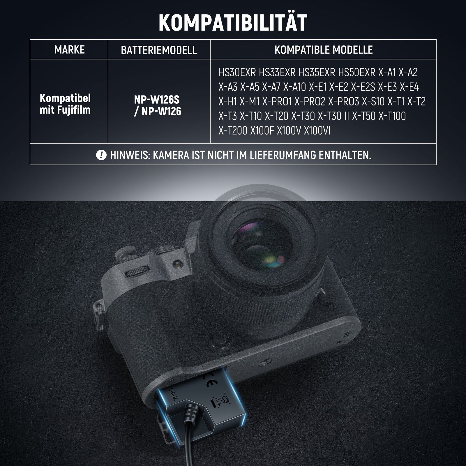 - Kompatible Gerätemodelle- Dieser Dummy Akku ist ein Ersatzakku für NP-W126S, NP-W126 und ist kompatibel mit Fujifilm HS30EXR, HS33EXR, HS35EXR, HS50EXR, X-A1, X-A2, X-A3, X-A5, X-A7, X-A10, X-E1, X-E2, X-E2S, X-E3, X-E4, X-H1, X-M1, X-Pro1, X-Pro2, X-Pro3, X-S10, X-T1, X-T2, X-T3, X-T10, X-T20, X-T30, X-T30 II, X-T100, X-T200, X100F, X100V, X100VI Kameras