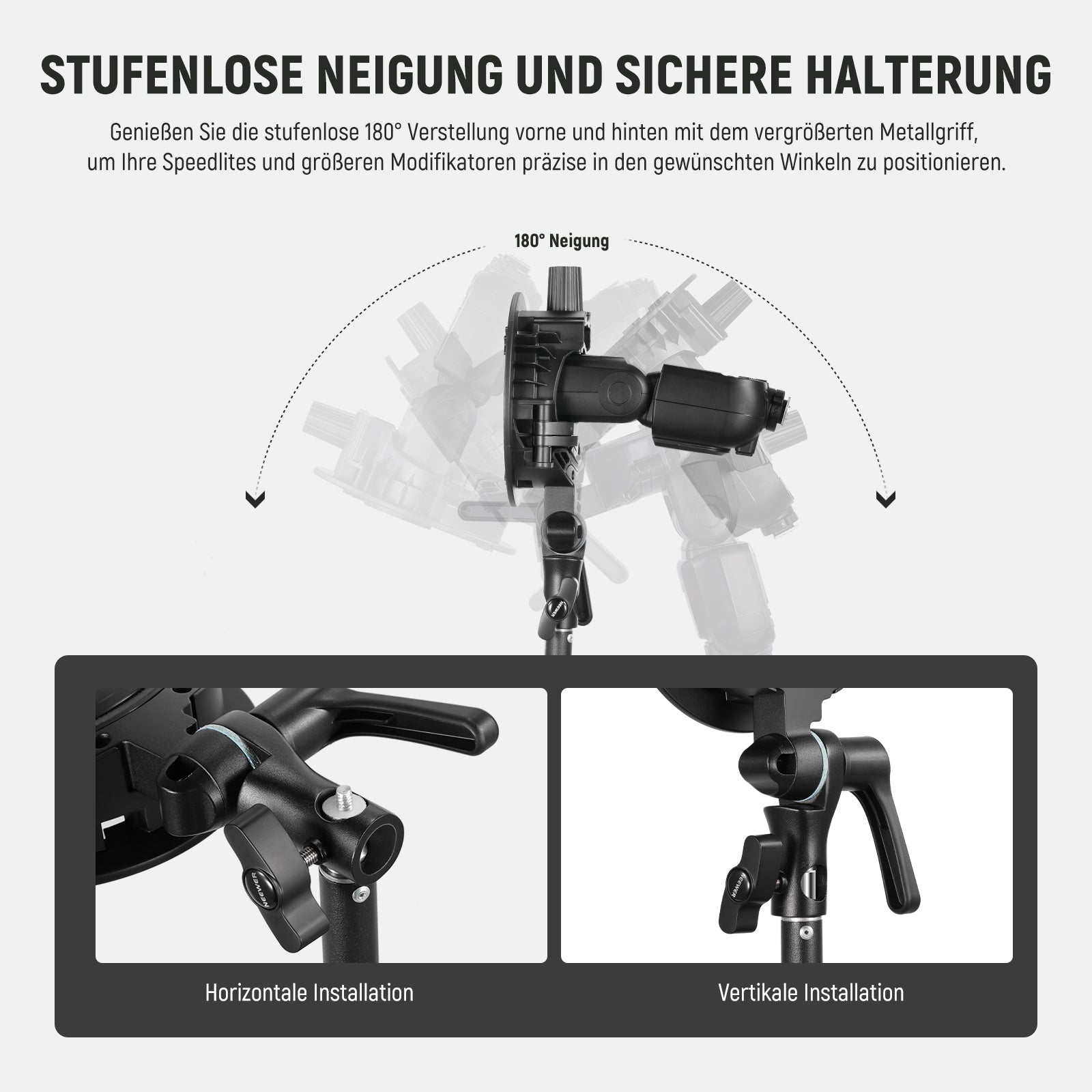 - 180° Neigung und sichere Montage- Der Adapter für die Stativbefestigung ist mit einem großen Griff für eine präzise 180° Neigungsbewegung ausgestattet. Er kann mit einem 5/8" Bolzen sicher an einem Lichtstativ befestigt werden oder als Handgriff für den flexiblen Einsatz in der Hand verwendet werden