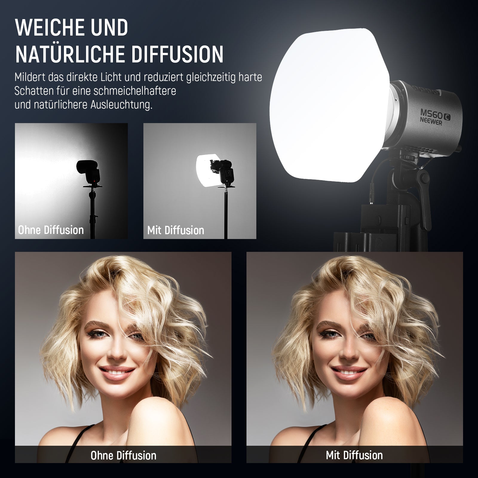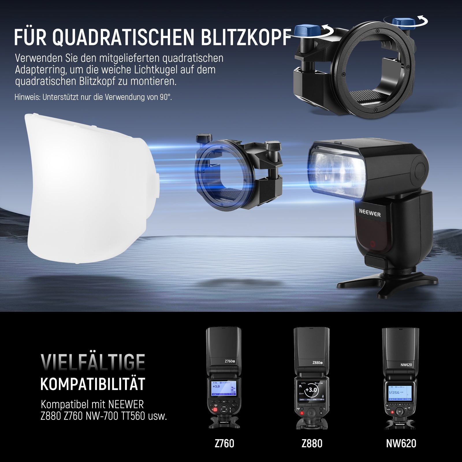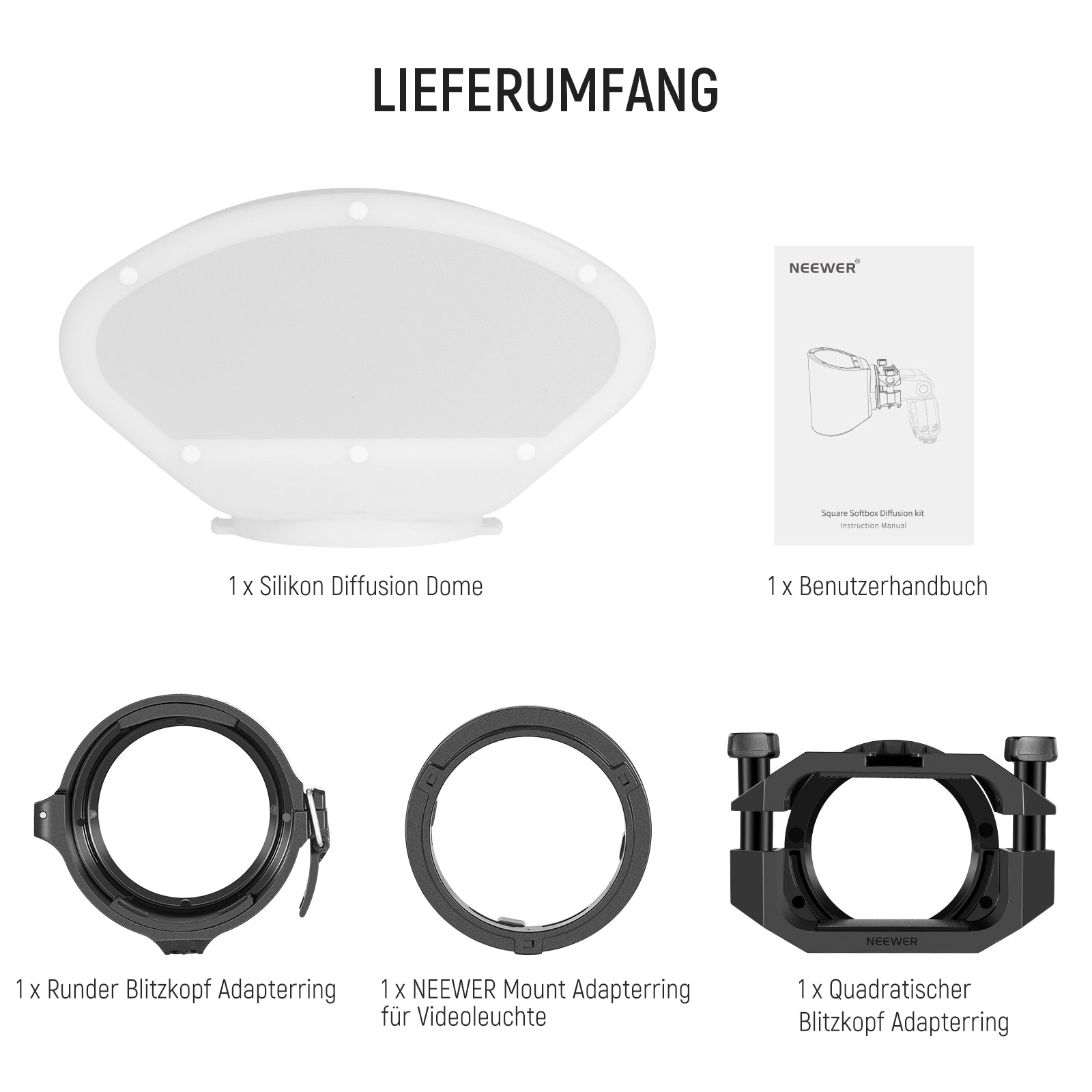 Was ist in der Box enthalten- 1 x Silikon Diffusion Dome, 1 x Quadratischer Blitzkopf Adapterring, 1 x Runder Blitzkopf Adapterring, 1 x NEEWER Mount Adapterring für Videoleuchte und 1 x Benutzerhandbuch