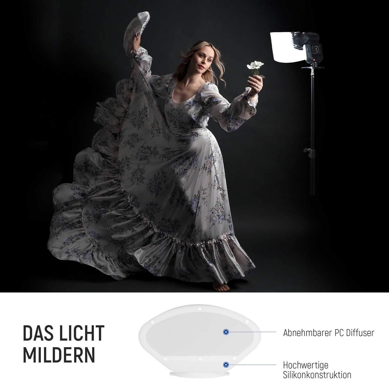 - Weiche und natürliche Diffusion- Diese aus hochwertigem Silikon gefertigte Blitz Diffusion Dome lässt sich auf die volle Größe von 7,8" x 4,9" x 5,7" /197 x 125 x 145mm ausdehnen und bietet genau das richtige Menge an Lichtdurchlässigkeit, um hartes Licht abzuschwächen, Schatten zu reduzieren und eine schmeichelhaftere, natürlichere Beleuchtung für Hochzeiten, Partys, Produktfotografie, Live Streaming, Videoaufnahmen usw. zu schaffen. Hinweis: nur bei vertikaler Montage auf Blitzen verwenden