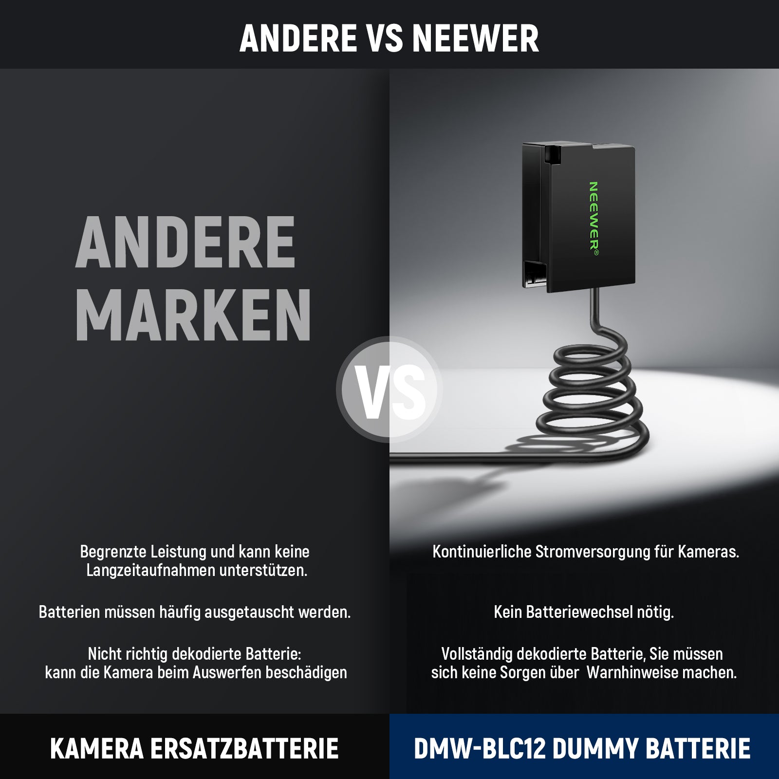 Batteriewechsel entfällt- Kein häufiger Batteriewechsel mehr! NEEWER DR-BLC12 Dummy Batterie Set ersetzt die Batterien DMW-BLC12 DMW-BLC12E DMW-BLC12PP und sorgt für eine kontinuierliche Stromversorgung Ihrer Kamera, so dass Sie längere Zeit ohne Unterbrechung oder Ersatzbatterien fotografieren können