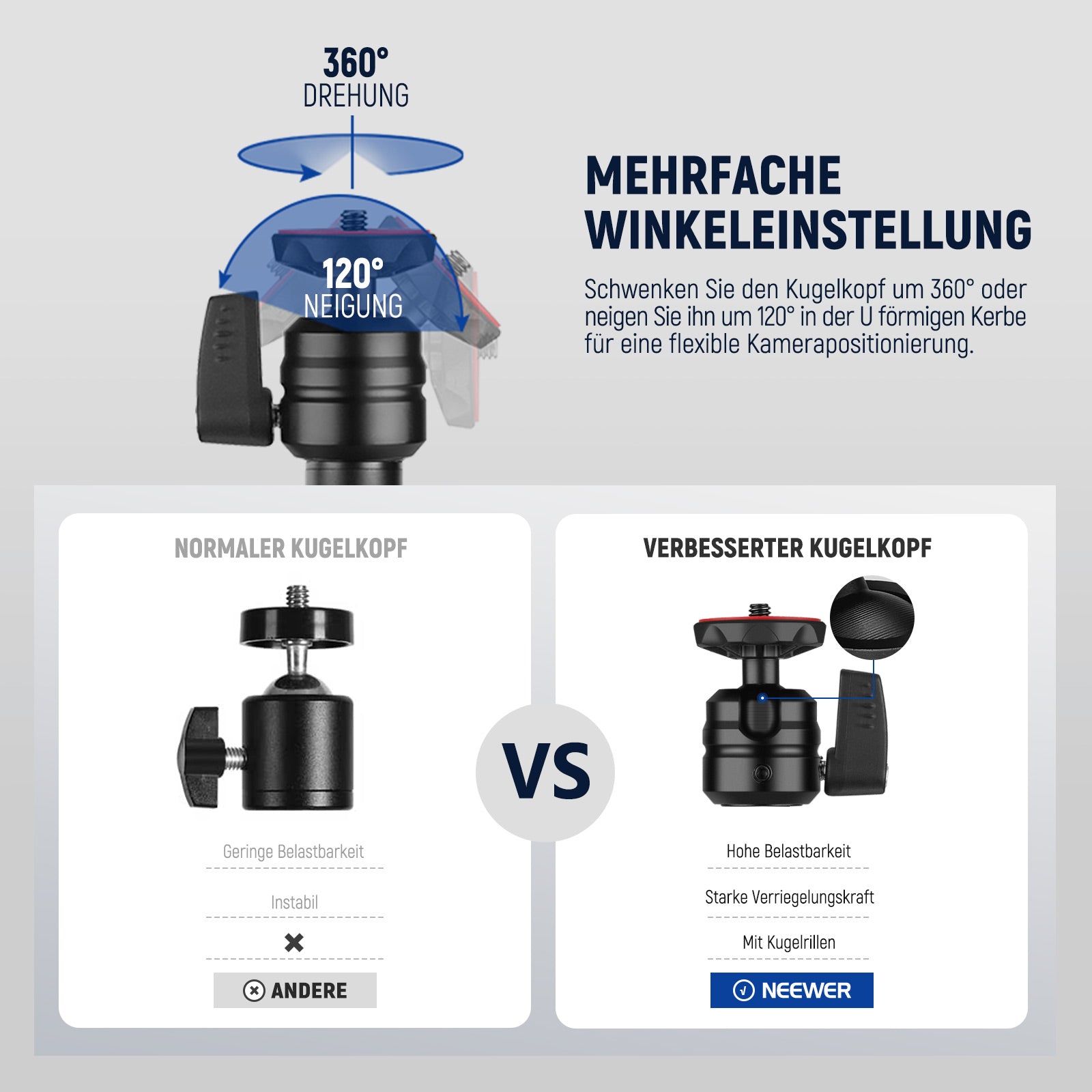- 【360° drehbarer Kugelkopf】 Der Kugelkopf bietet eine 360° Drehung und 120° Neigungsbewegungen für eine flexible Winkelpositionierung. Sichern Sie den Kugelkopf im idealen Winkel mit dem Feststellknopf