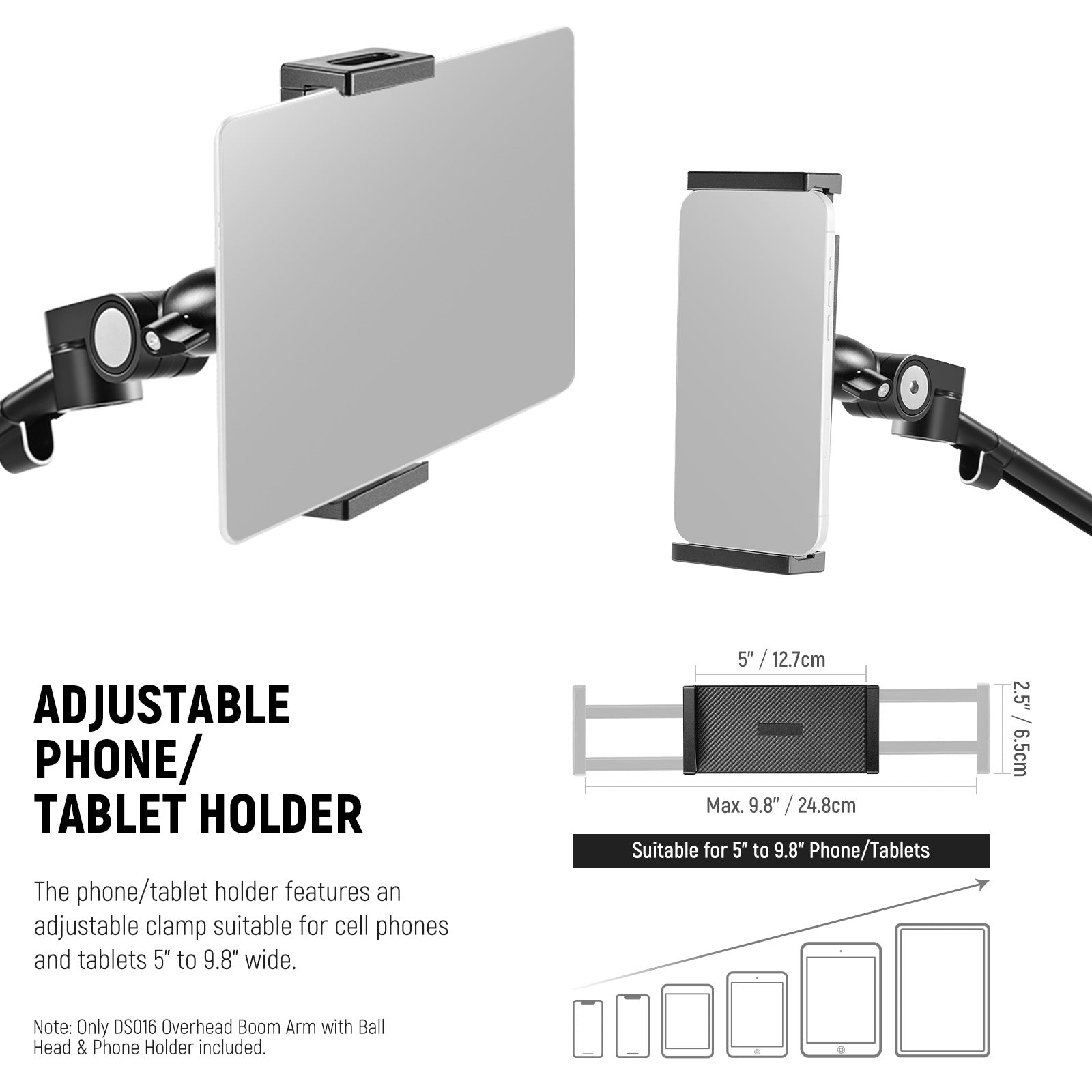 - Robuster Tisch Kamerahalterungsarm- Mit einer Tragfähigkeit von 17,6Pfund/8kg bietet der Telefon/Tablet Halterungsarm mit Kugelkopf eine stabile Halterung für Telefon, Tablet, Kamera, LED Videoleuchte und einen kleinen Monitor. Zwei Abschnitte ermöglichen Höhen und Winkeleinstellungen und gewährleisten Stabilität für Videoaufnahmen, Live Streaming und Online Konferenzen. Hinweis: Beinhaltet nur einen Desktop Montagearm