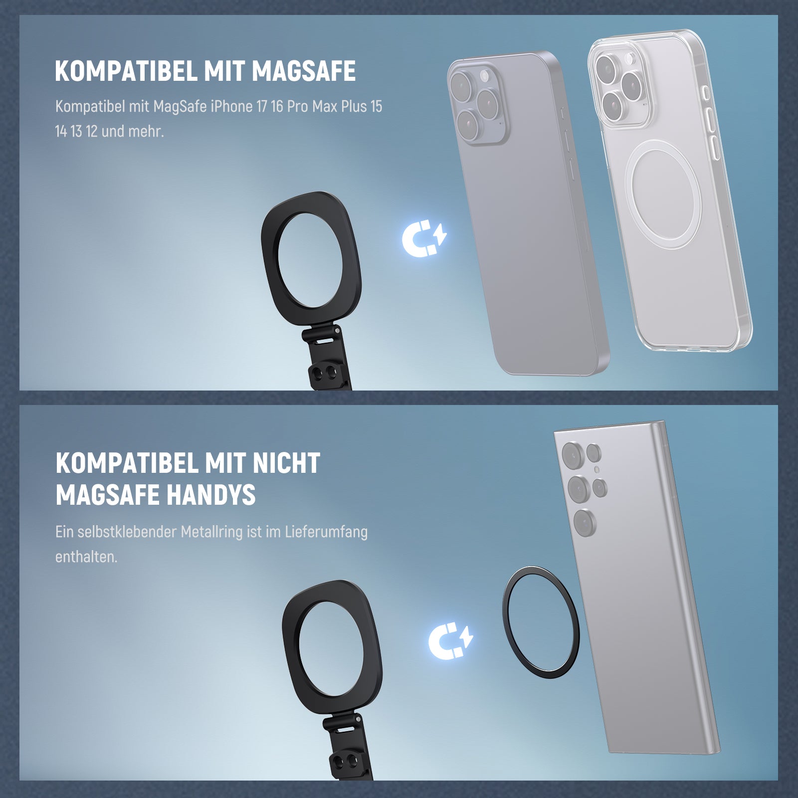 - 【Starke Magnetkraft】 Kompatibel mit MagSafe iPhone 17 16 Pro Max Plus mag safe 15 14. Der magnetische Handystativ Adapter als Smartphone Kamera Zubehör mit Dämpfungsgelenk sorgt für sofortige und sichere Befestigung für stabile Videoaufnahmen und flüssiges Streaming