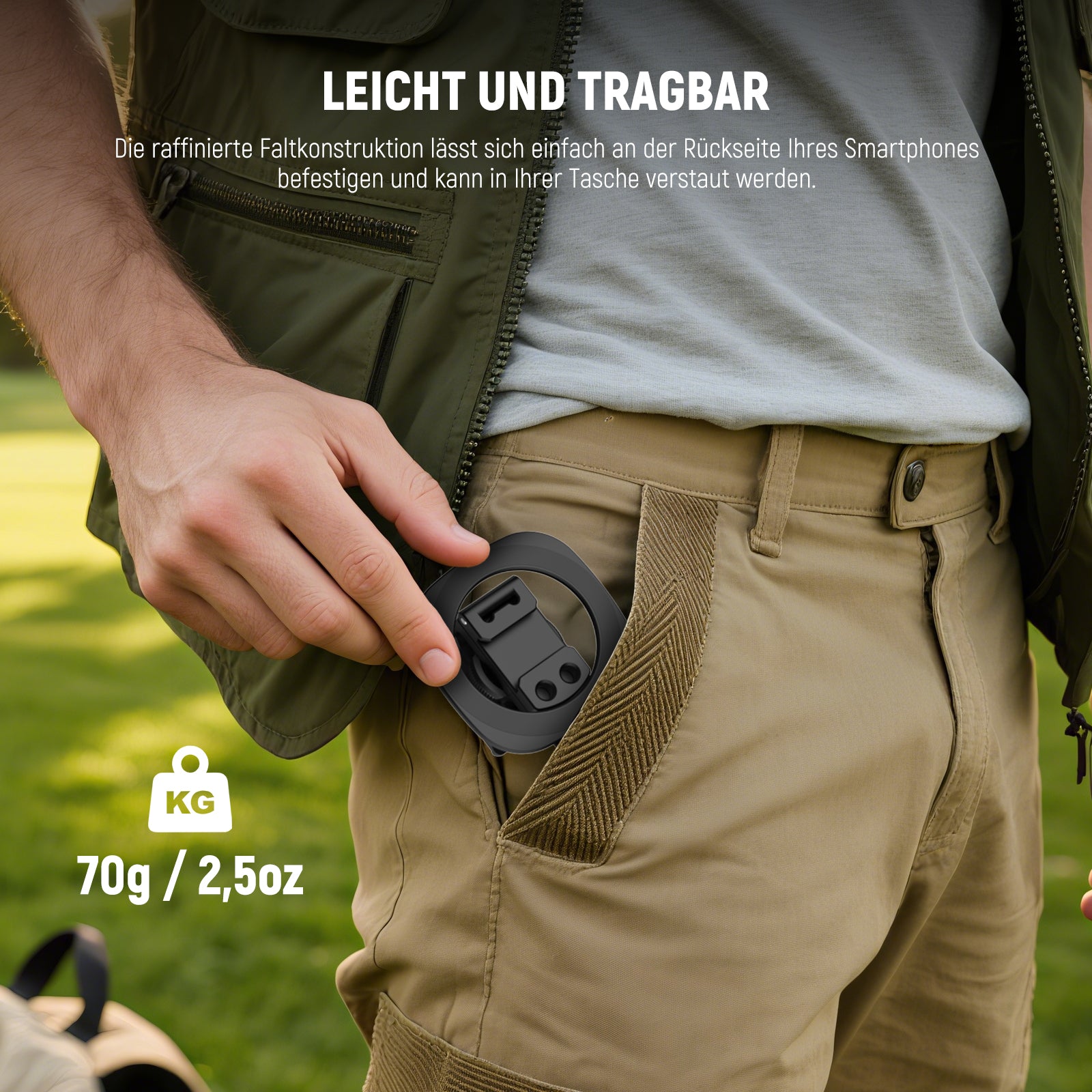 - 【Kompakt und leicht】 Die Halterung für Smartphone, die kompatibel mit iPhone ist und als Fotozubehör für Stativfotografie dient, lässt sich auf eine kompakte Größe zusammenklappen und wiegt nur 70g. Sie ist daher ideal für die Erstellung von Inhalten unterwegs, für Reisefilme, Vlogging, Videoaufnahmen usw