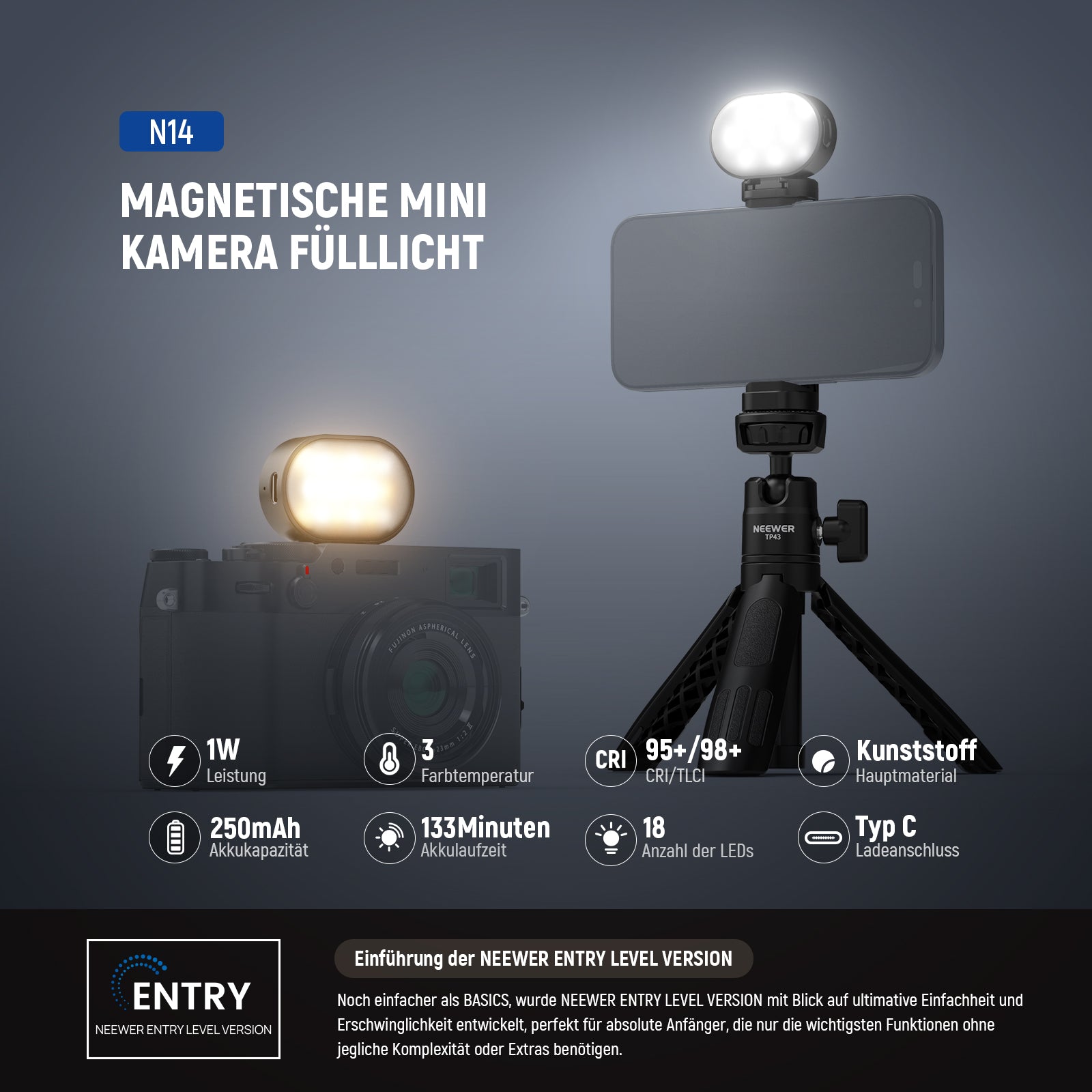 - Wir stellen die NEEWER ENTRY LEVEL VERSION vor- Noch einfacher als BASICS, wurde NEEWER ENTRY LEVEL VERSION mit Blick auf ultimative Einfachheit und Erschwinglichkeit entwickelt, perfekt für absolute Anfänger, die nur die wichtigsten Funktionen ohne jegliche Komplexität oder Extras benötigen. Das N14 ist ein leichtes Mini Selfie Licht für Kamera und Handy mit langer Laufzeit und einfacher USB Aufladung, ideal als unverzichtbare Beleuchtungsausrüstung für Content Creators, die unterwegs sind