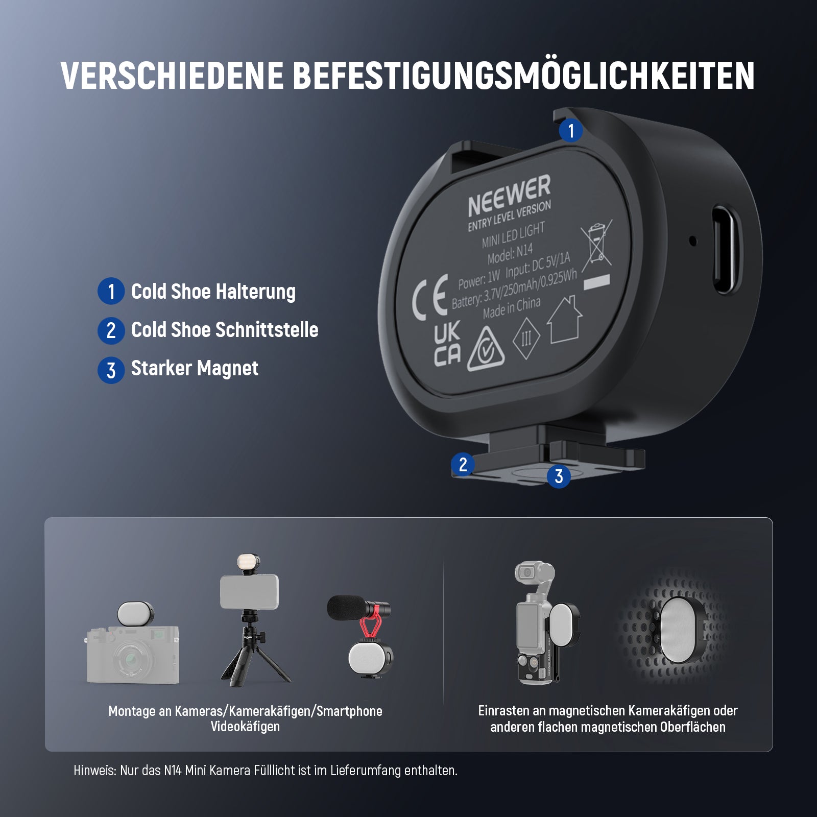 - Schnelle magnetische Befestigung mit Cold Shoes- Der N14 wurde für Video Kameralicht und für Handy Videografie entwickelt und verfügt über eine Cold Shoe Halterung und eine Cold Shoe Schnittstelle an den Seiten für Cold Shoe Kameras oder Smartphone Videokäfige. Die Cold Shoe Mount verfügt über einen starken Magneten zur schnellen Befestigung an magnetischen Kamerakäfigen. Kompatibel mit NEEWER M21 Foto Licht und AC024 Zubehör Verlängerungsadapter Halterung, kompatibel mit DJI OSMO pocket 3