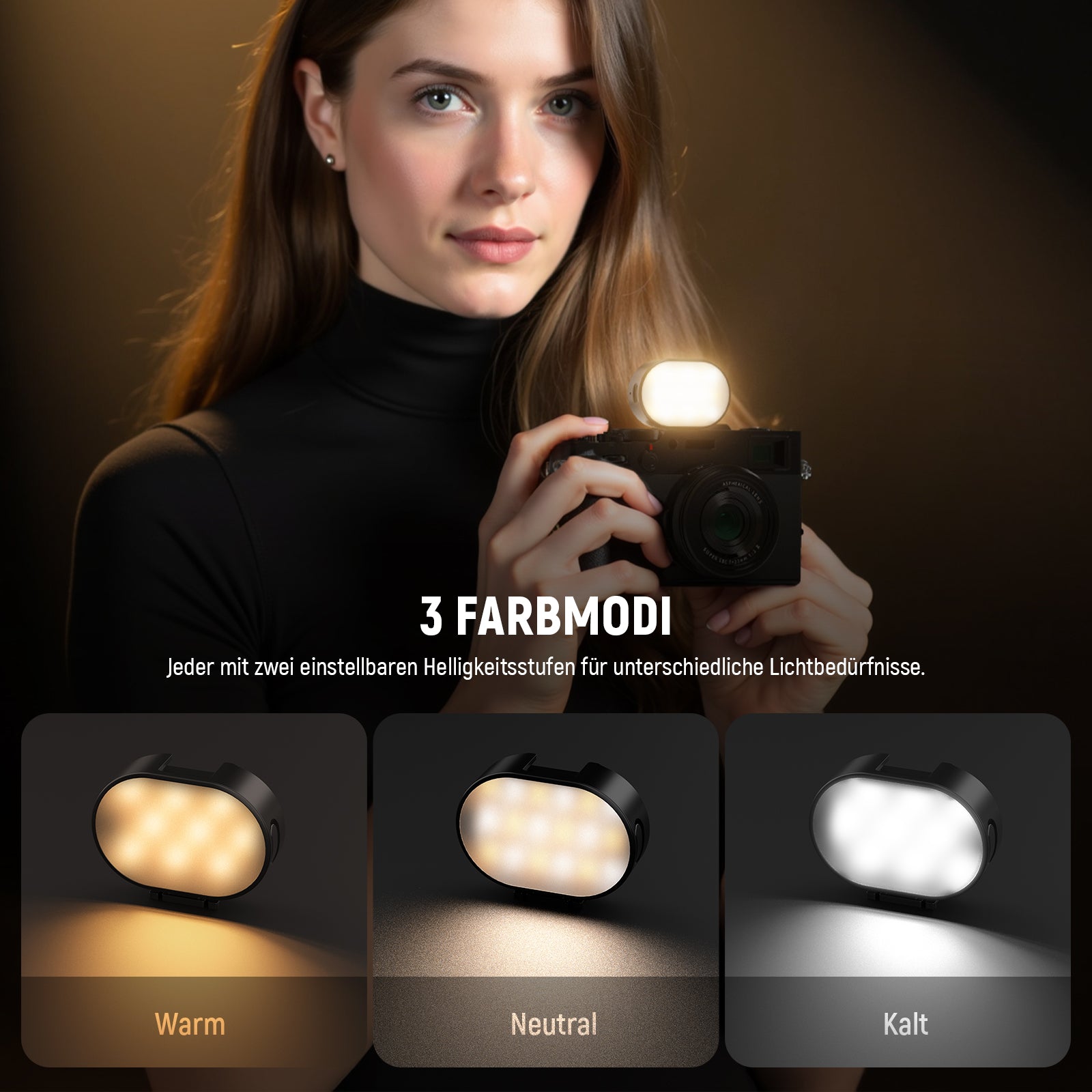 - 3 Farbmodi mit einstellbarer Helligkeit- Diese Mini Kamera Fotolicht mit 9 warmen und 9 kühlen Hochleistungs LEDs bietet 3 Farbtemperaturmodi (warm, neutral, kühl) mit jeweils 2 einstellbaren Helligkeitsstufen für unterschiedliche Beleuchtungsanforderungen. Mit einem hohen CRI95+/TLCI98+ gewährleistet es eine präzise Farbwiedergabe. Alle Einstellungen werden über eine einzige Taste gesteuert, was eine schnelle und unkomplizierte Anpassung ermöglicht
