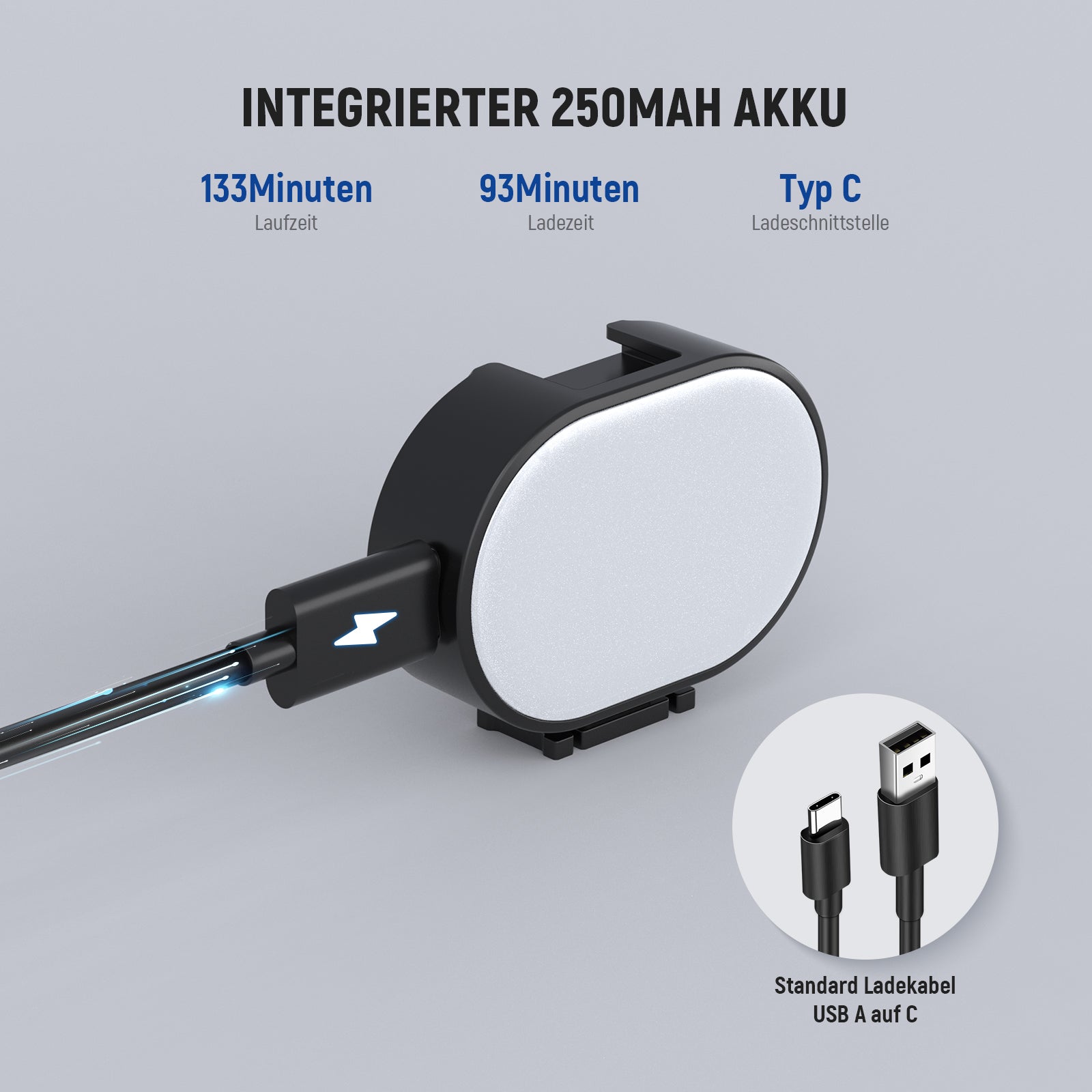 133 Minuten lange Laufzeit und schnelles Aufladen über USB C- Der integrierte 250mAh Akku sorgt bei voller Ladung für bis zu 2 Stunden und 13 Minuten Dauerlicht bei voller Helligkeit und lässt sich über ein tragbares Ladegerät, einen Laptop, ein Autoladegerät oder jede andere USB Stromquelle mit dem mitgelieferten USB C Ladekabel in 93 Minuten vollständig aufladen. Perfektes Video Camera Light für die Erstellung von Inhalten im Freien, ohne Probleme mit der Stromversorgung unterwegs