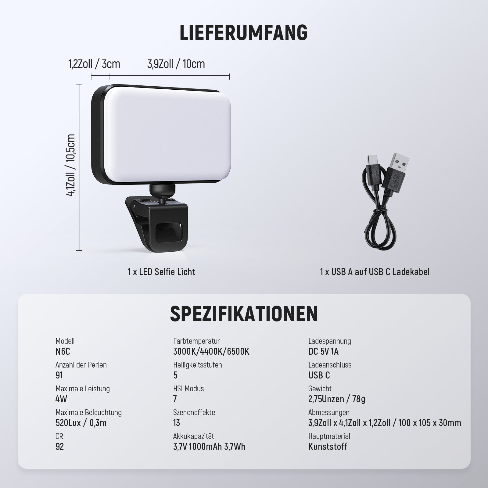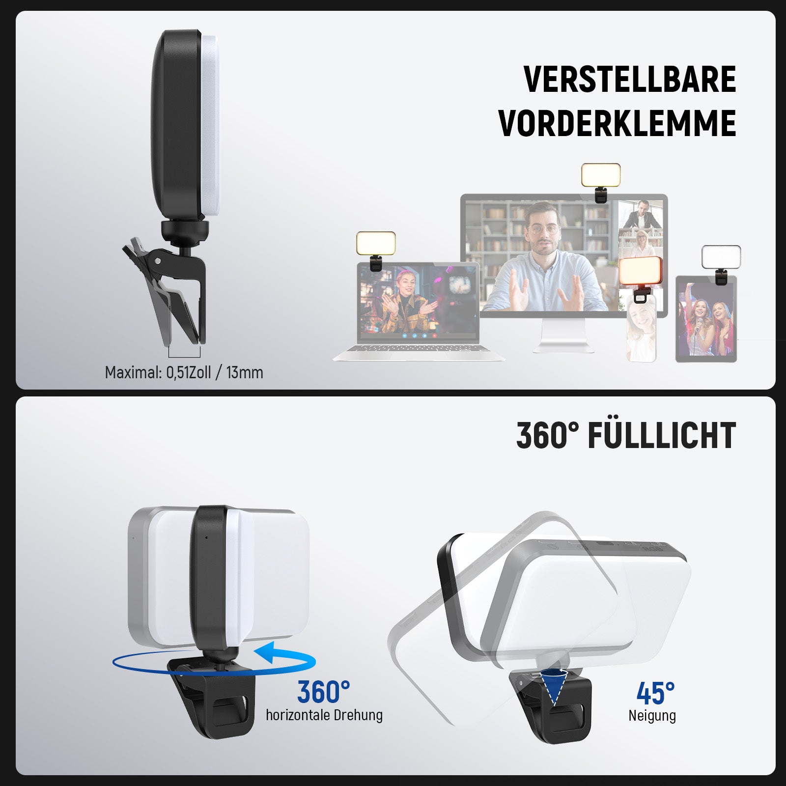 - Kompaktes und leichtes Videolicht- NEEWER N6C Clip on Selfie Leuchte zum Anklipsen ist hochwertiges, weiches Fülllicht mit kompakten Abmessungen von 100x105x30mm und Gewicht von nur 78g. Befestigen Sie sie an Handykamera (kompatibel mit iPhone), Laptop oder Desktop PC, um Ihre Haut zu schmeicheln und Ihr Aussehen bei Selfies, Live Streaming und mehr zu verbessern. Die Klemme verfügt über Kugelkopf, der 360° Drehung und Neigung nach vorne und hinten für vielseitige Beleuchtungswinkel ermöglicht