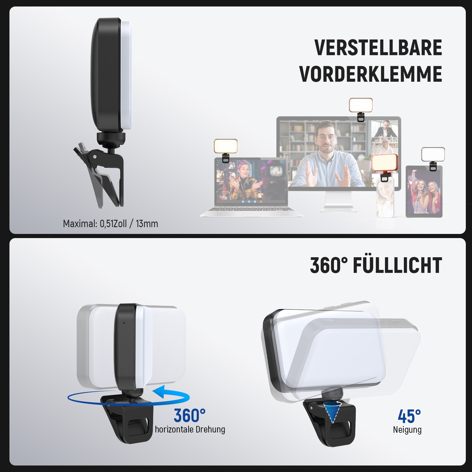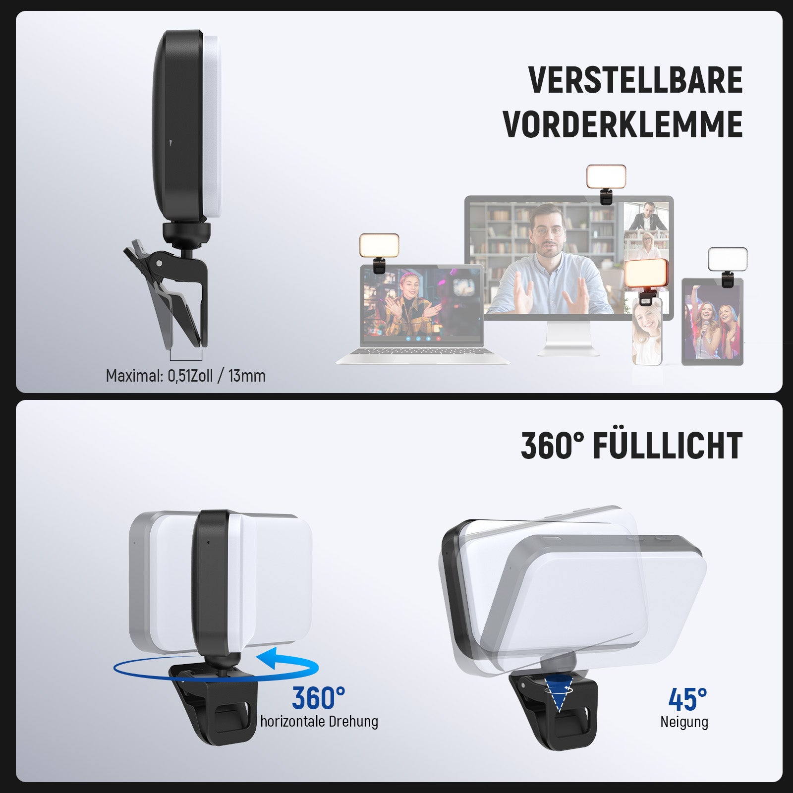 - Kompaktes & leichtes Handylicht- NEEWER N8 Clip auf Overhead Videolicht ist ein Premium Soft Fülllicht, kompakt bei 85x94x18mm, wiegt nur 55g. Befestigen Sie es an einer Handykamera (kompatibel mit iPhone), einem Laptop oder einem Desktop PC, um Ihrer Haut zu schmeicheln und Ihren Look bei Selfie Fotos, Vlog Aufnahmen, Videokonferenzen, Live Streaming, Zoom Anrufen und mehr zu verbessern. Die Klemme verfügt über einen Kugelkopf, der eine 360° Drehung und eine Neigung von vorne nach hinten