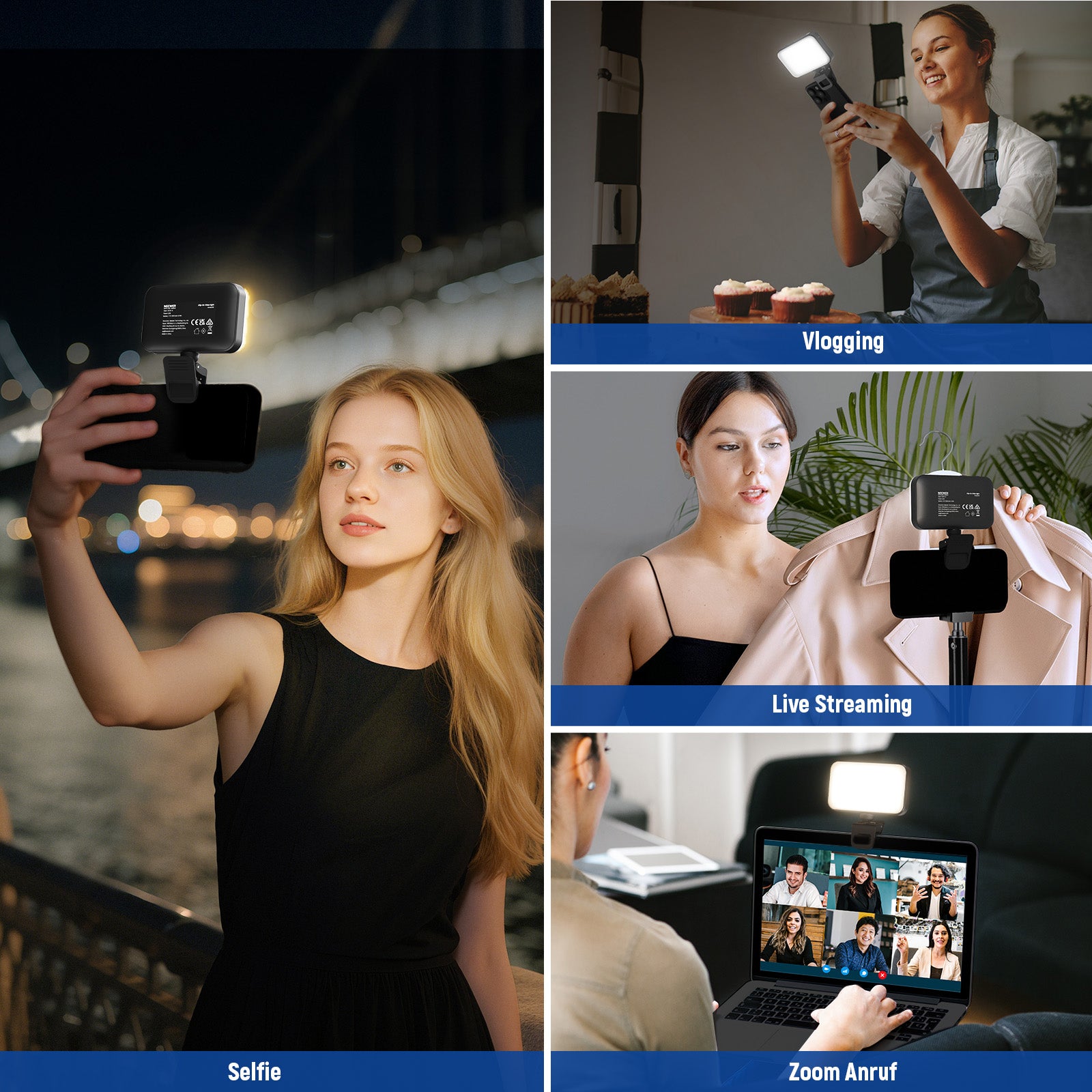 - Aufladbares LED Video Aufhelllicht- Der eingebaute 650mAh Akku versorgt das Handy Videoleuchte bis zu 50 Minuten mit einer vollen Ladung. Einfach aufzuladen mit einer 5V/1A Stromquelle (Wandladegeräte, tragbare Ladegeräte oder Computer) mit dem USB Typ Ladekabel, dieses Telefon füllen Licht ist eine ideale Wahl für mühelose on the go Content Erstellung als tragbare Schöpfer wesentliche selfie Zubehör, Streamer und Influencer muss Fotografie Ausrüstung haben. HINWEIS: Für eine optimale Akkulaufzeit laden Sie das Gerät bitte vor der ersten Verwendung vollständig auf.