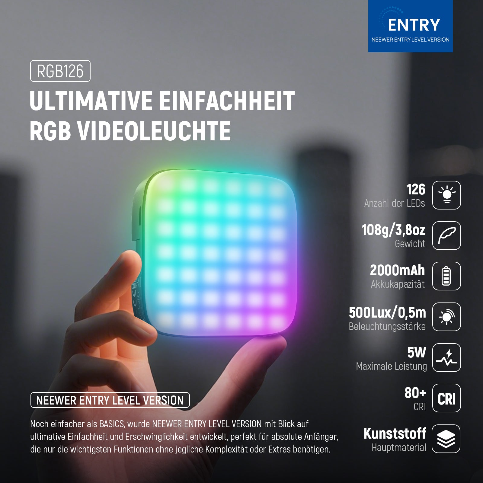 - Vorstellung der NEEWER ENTRY LEVEL VERSION- Die NEEWER ENTRY LEVEL VERSION ist noch einfacher als die BASICS Version und wurde mit Blick auf ultimative Einfachheit und Erschwinglichkeit entwickelt. Sie ist perfekt für absolute Anfänger, die nur die wichtigsten Funktionen ohne Komplexität oder Extras benötigen. Hinweis: Bei Verwendung während des Ladevorgangs sinkt die Leistung des RGB126 automatisch auf 3,5 W