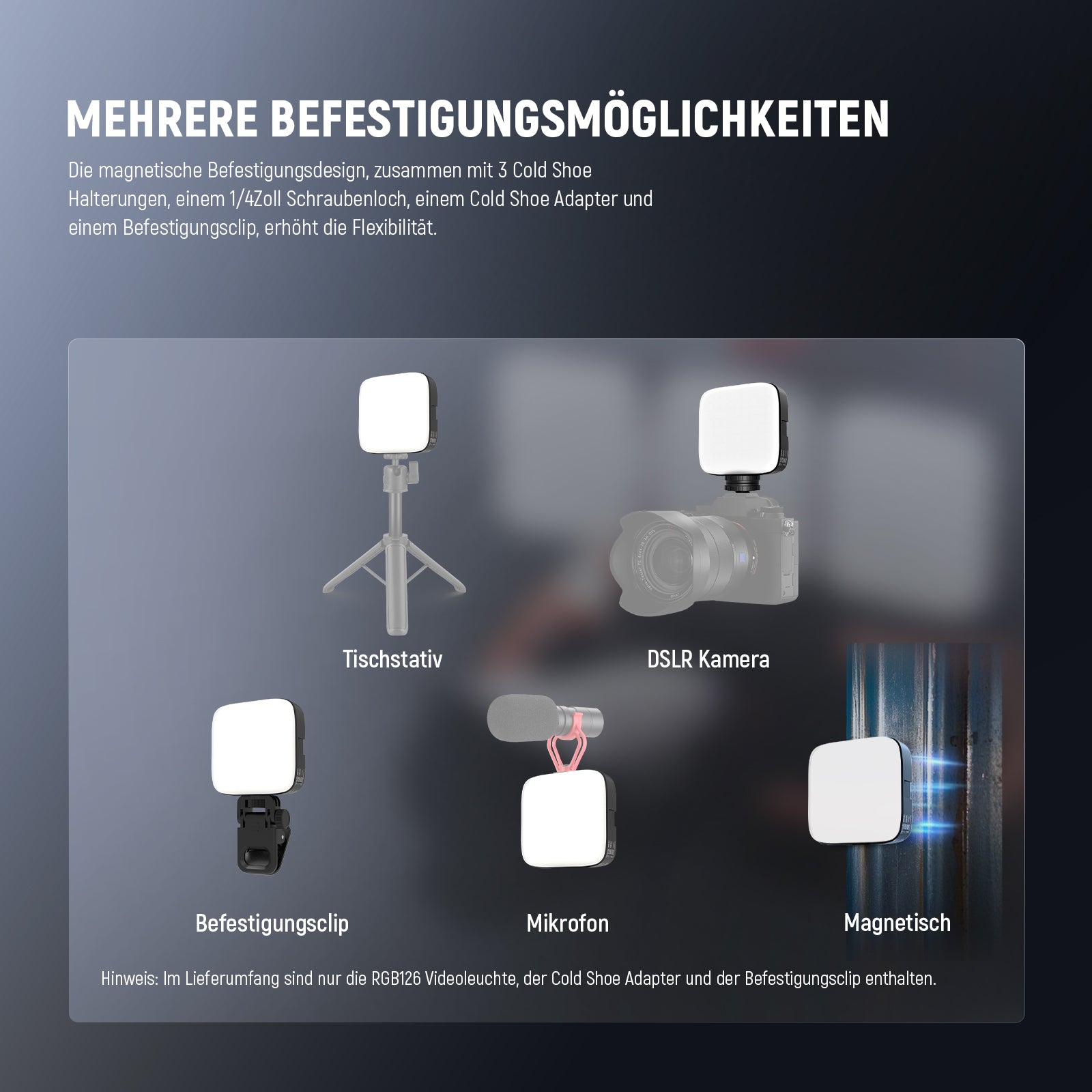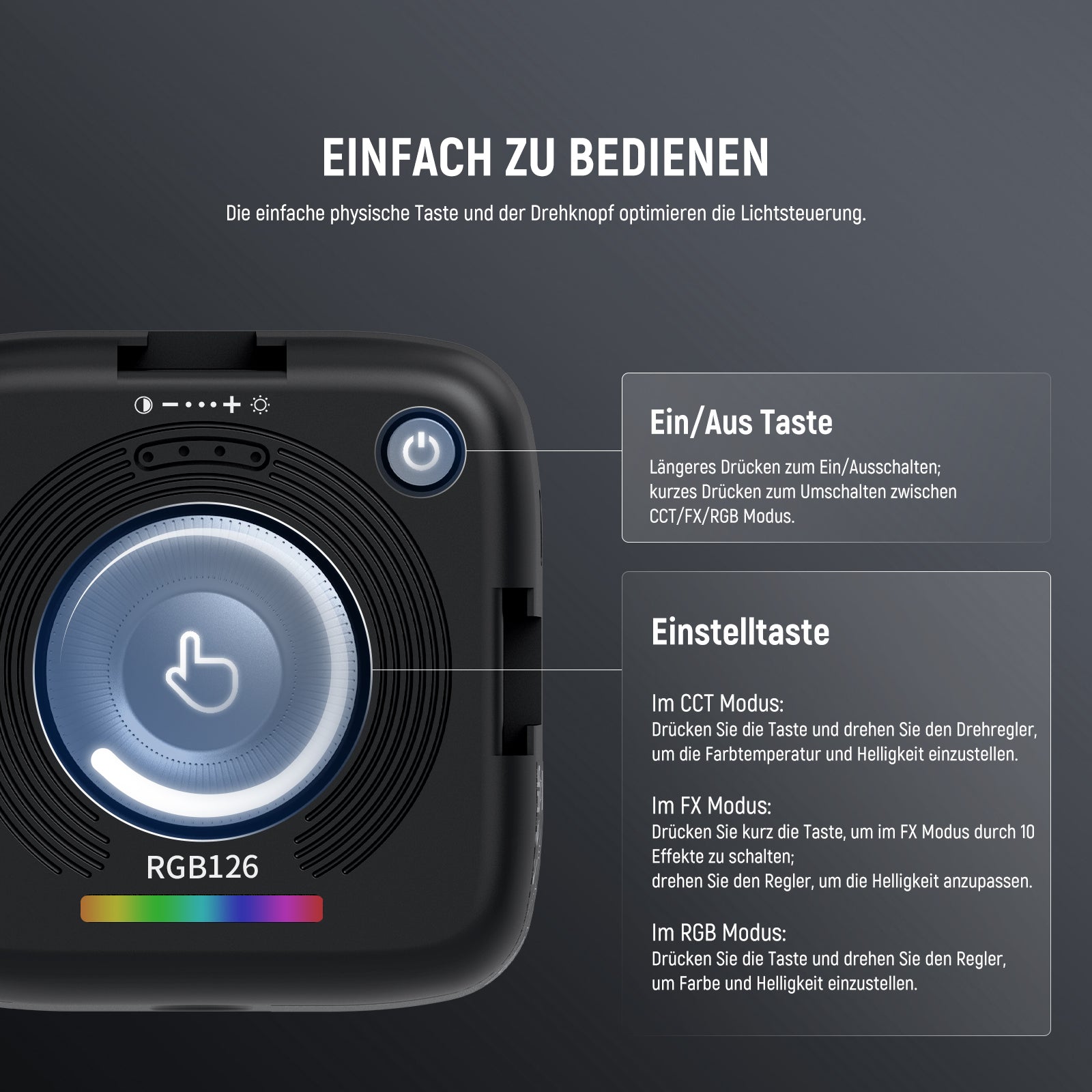 - Kompaktes und tragbares Foto Licht- RGB126 ist tragbares Mini LED Füllwürfel Panel Licht für Kameras Fotografie mit den Maßen 76 x 76 x 35mm und einem Gewicht von nur 108g inklusive Diffusor. Es kann auch an einem Laptop befestigt oder magnetisch angebracht werden, um als Haupt oder Fülllicht schöne Momente einzufangen. Der einfache physische Knopf und Drehregler optimieren die Lichtsteuerung und sind unverzichtbar für Social Media Content Creator, Make up Artists, Live Streamer und Influencer
