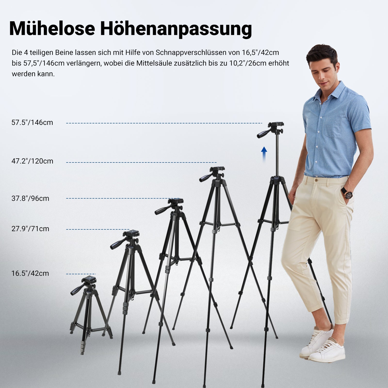 Mühelose Höhenverstellung- Die 4 Abschnittsbeine können leicht von 16,5"/42cm bis 57,5"/146cm mit Flip Locks eingestellt werden. Gleichzeitig kann die Mittelsäule zusätzlich auf bis zu 26cm angehoben werden, so dass Sie flexibel sind, um jede zufriedenstellende Aufnahme zu machen. Auch mit einem Haken an der unteren Mittelsäule zum Aufhängen von Gewichten für zusätzliche Sicherheit