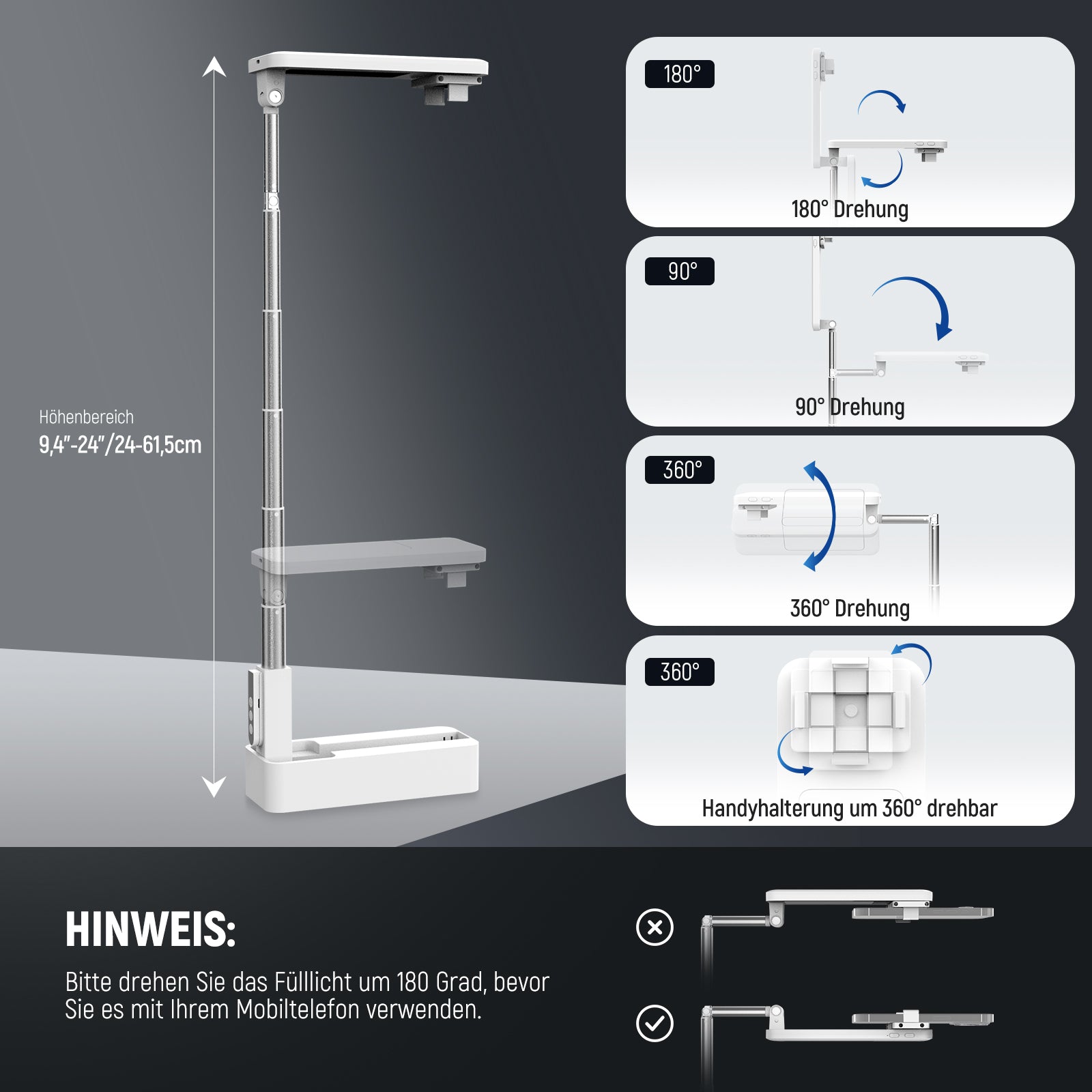 Vollständig flexible Winkeleinstellung- Der Leuchtenkopf ist um 360° schwenkbar und um 180° neigbar, das Videoleuchte Panel um 180° klappbar und der obere ausziehbare Bereich um 90° klappbar. Ob für Überkopf, Aufwärts, vertikale oder horizontale Aufnahmen, der multifunktionale Selfie Ständer mit Smartphone Halterung hat Sie abgedeckt. Er wird für Live Streaming von Makeup Artists, Desktop Videokonferenzen über Laptop Webcams, Zoom Anrufe, Meetings und Video Podcasts verwendet