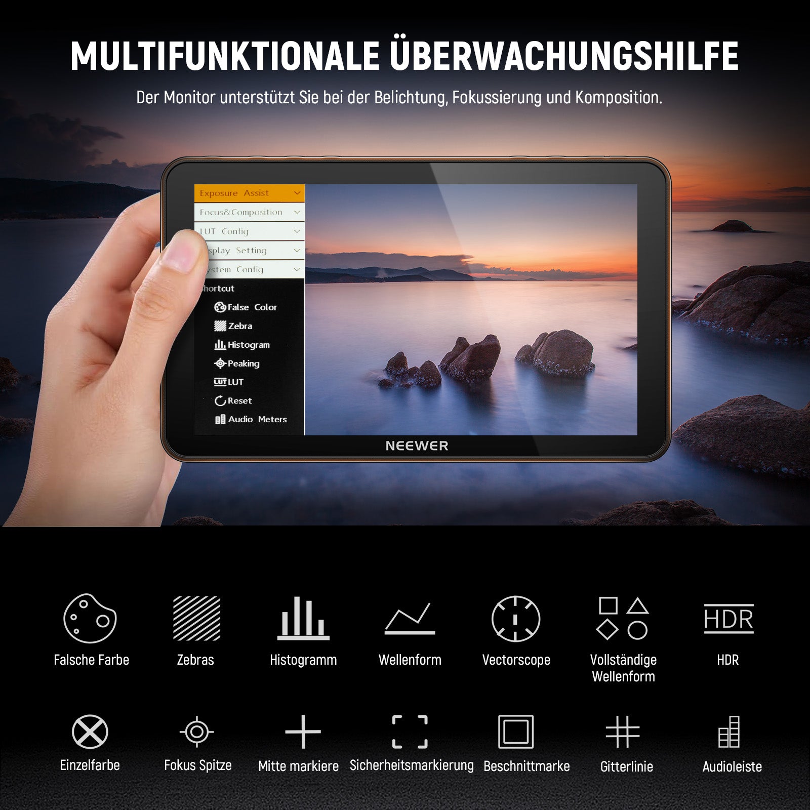- Vielseitige Überwachung und benutzerdefiniertes 3D LUT hochladen- Der Feldmonitor bietet Falschfarben, Zebras, Histogramm, Oszillogramm, volle Wellenform, Vektorskop, HDR, Einzelfarbe, Spitzenfokus, Audioleiste und weitere professionelle Funktionen mit Tastenkombinationen (F1, F2, F3) oben für schnellen Zugriff. Mit 15 vorinstallierten 3D LUT unterstützt der Monitor Hochladen von bis zu 60 benutzerdefinierten 3D LUT Dateien und sogar Aktualisierung der Firmware über SD Karte (nicht enthalten)