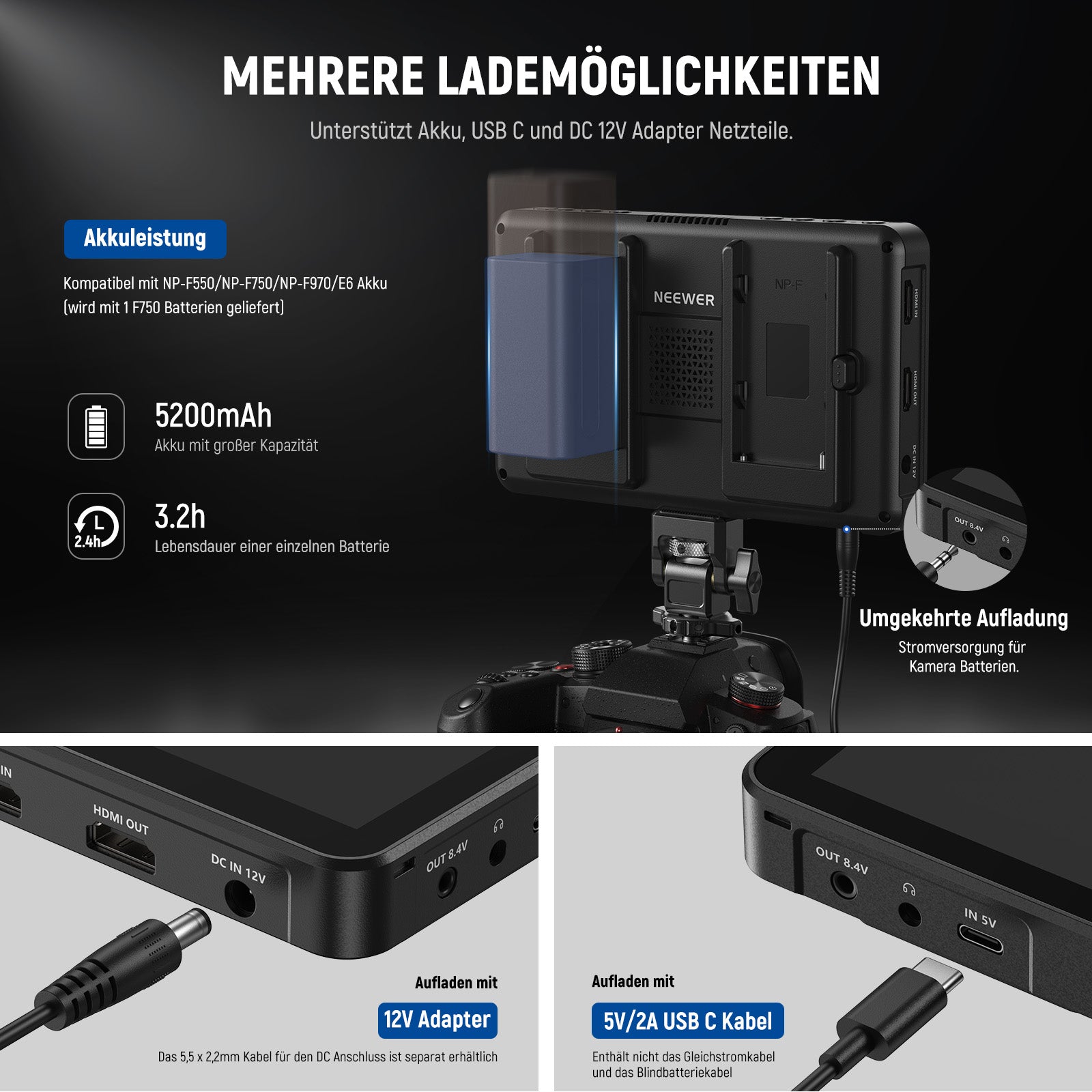 - Vielseitige Optionen für die Stromversorgung- Der DSLR Monitor unterstützt NP-F Akku Kompatibilität (NP-F550/750/970), DC Anschluss (Kabel nicht im Lieferumfang enthalten) und Typ C Laden. Die beiden 4400mAh NP-F750 Akkus bieten jeweils 2,4 Stunden Laufzeit oder zusammen 4,8 Stunden und können mit Schnellladegeräten mit 5V/3A oder höher oder tragbaren Ladegeräten (3A Ausgang) und dem mitgelieferten USB zu Typ C Kabel aufgeladen werden