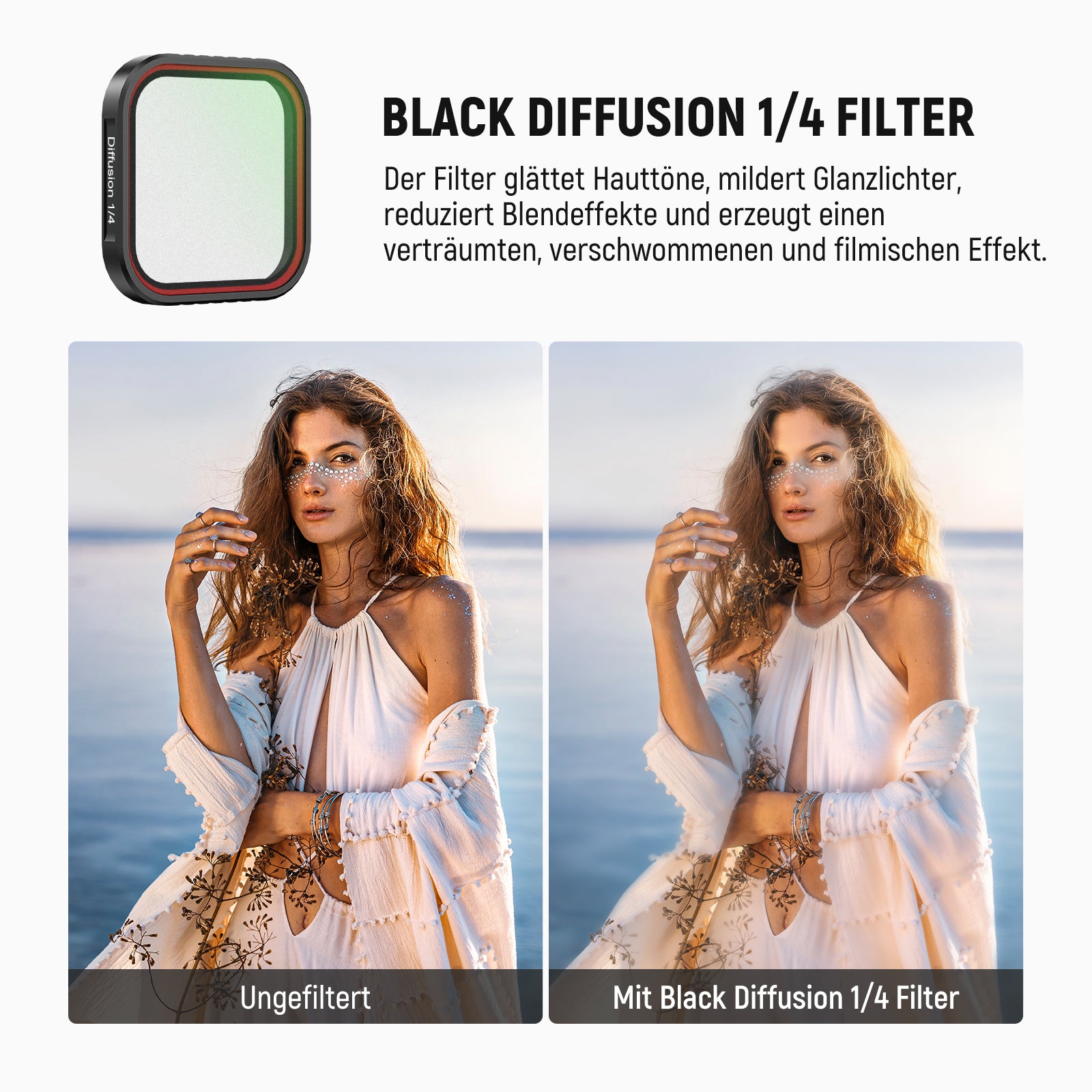 - Verträumter und filmischer(FL-C21)- Der Black Diffusion 1/4 Filter glättet Hauttöne, mildert Glanzlichter, reduziert Blendeffekte und erzeugt einen verträumten, verschwommenen und filmischen Effekt für Porträtfotografie, Videoaufnahmen und Vlogging