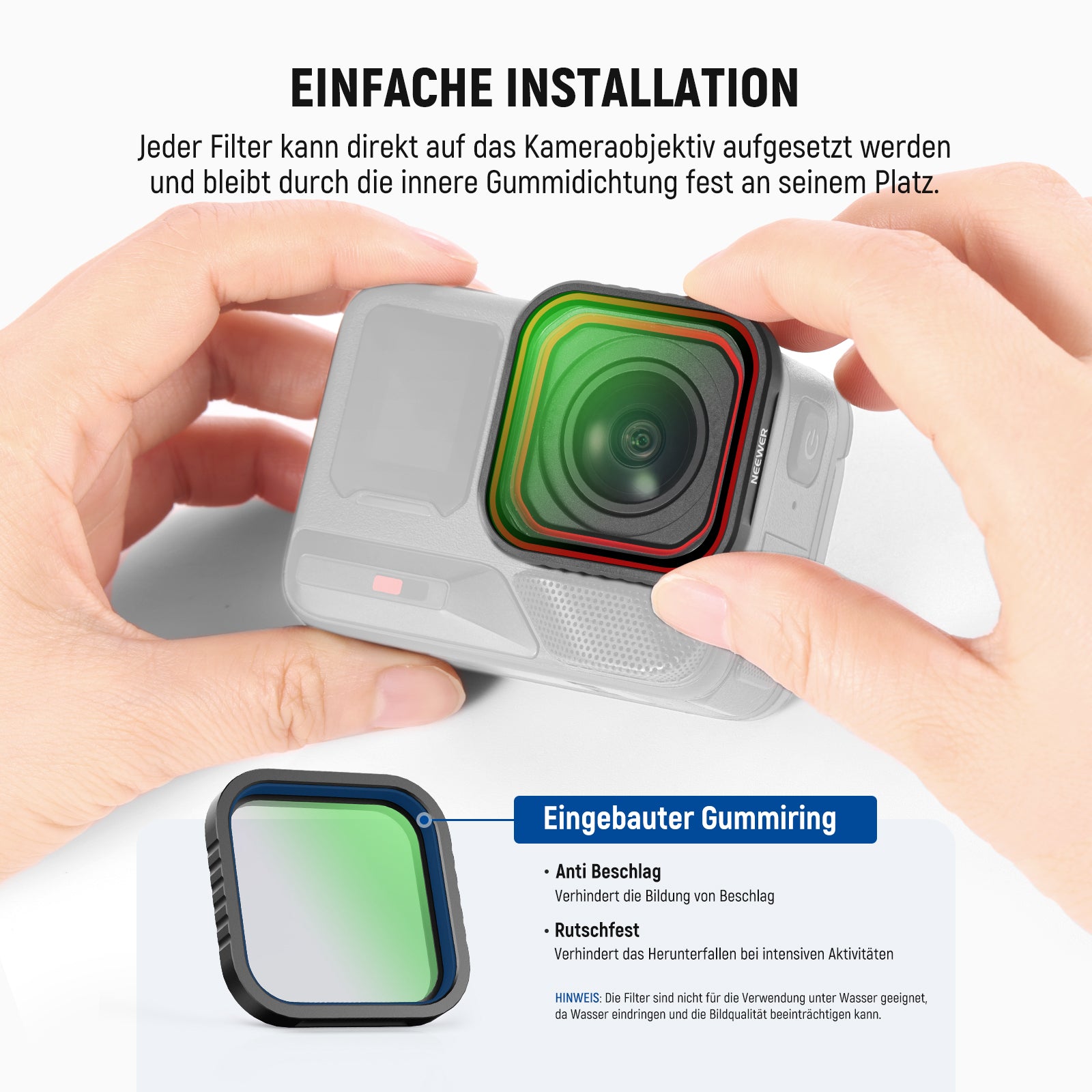 - Schneller Snap On Aufsatz- Jeder Filter kann direkt auf das Kamera Objektiv aufgesetzt werden und bleibt dank der inneren Gummidichtung sicher an seinem Platz. Hinweis: Die Filter sind nicht für den Einsatz unter Wasser geeignet, da Wasser eindringen und die Bildqualität beeinträchtigen kann