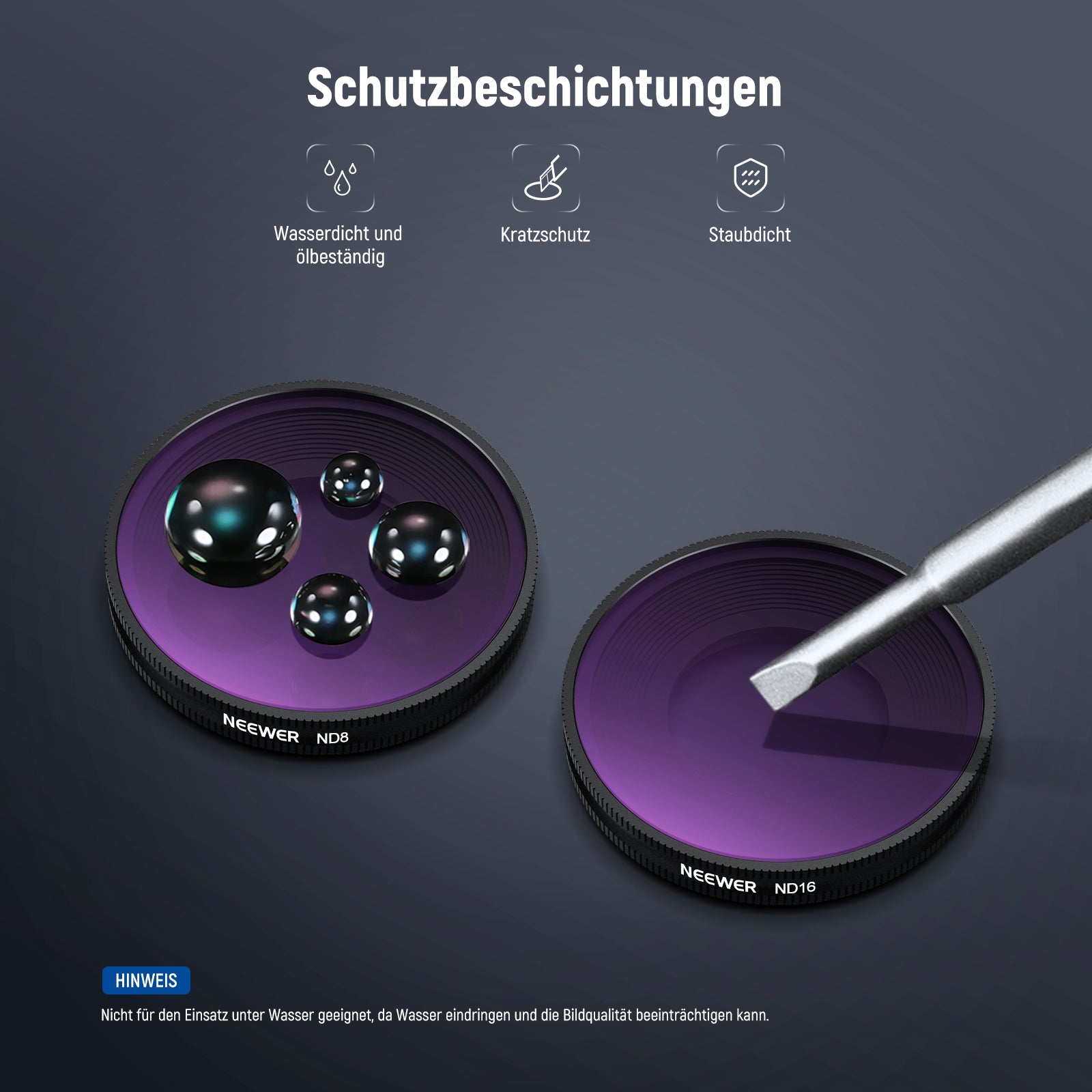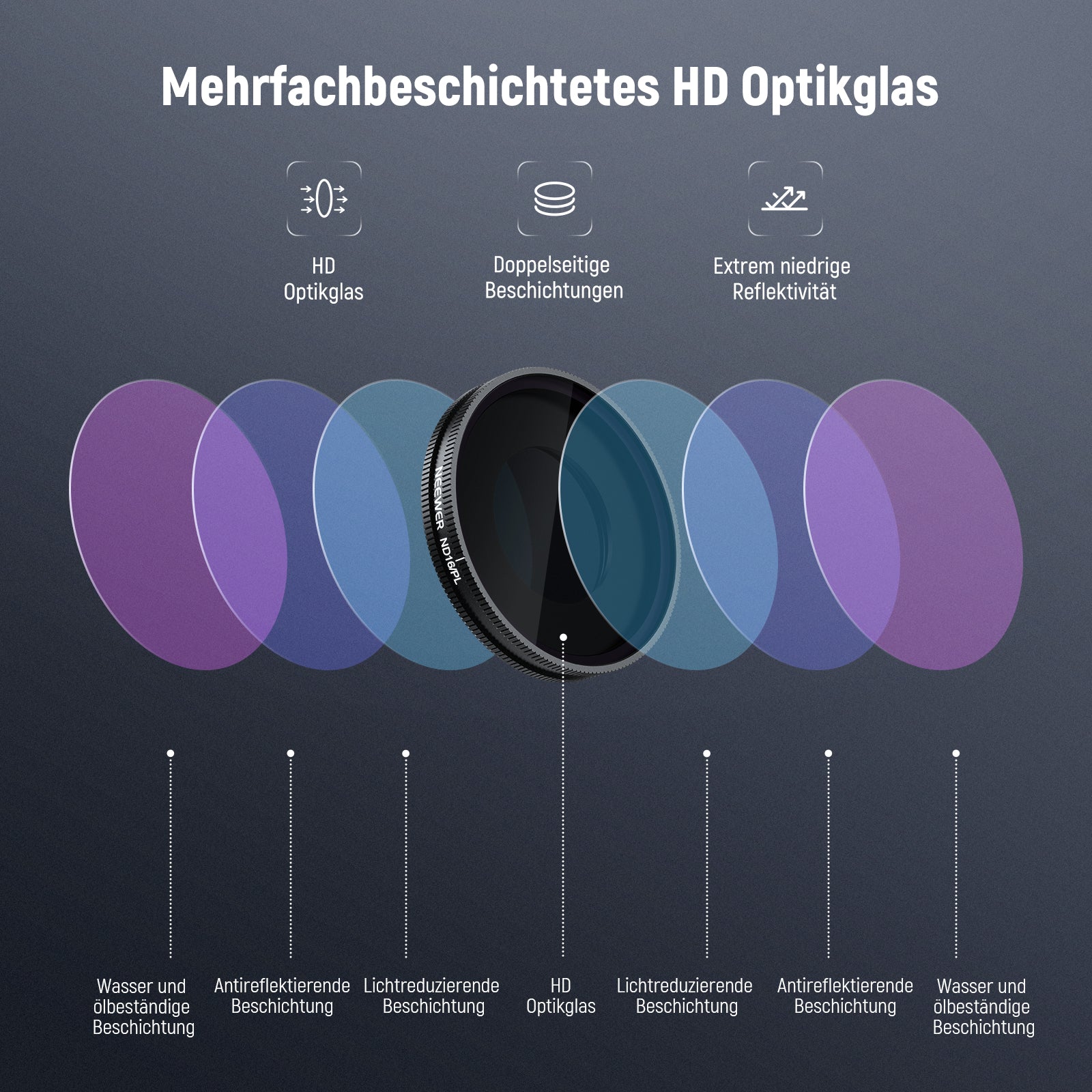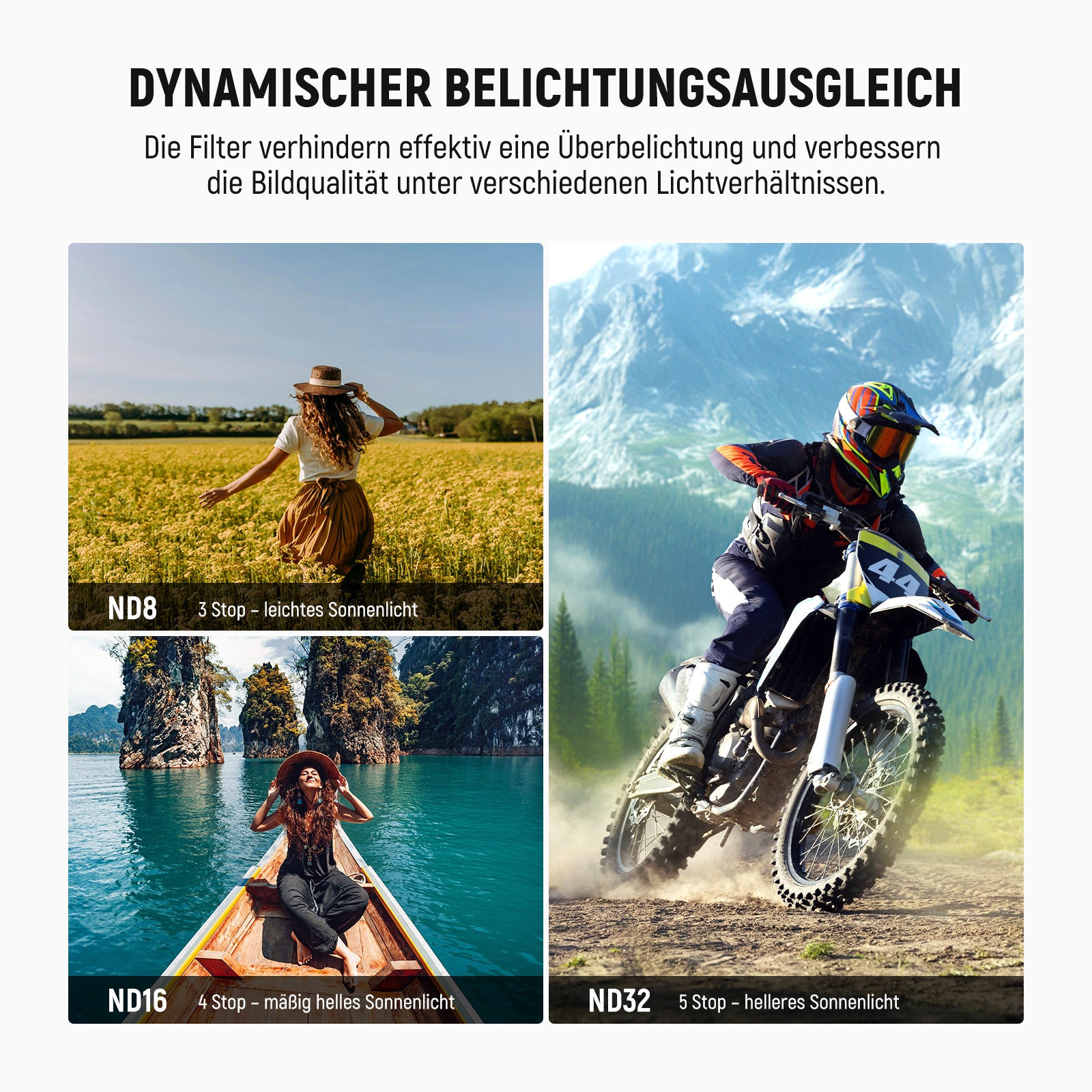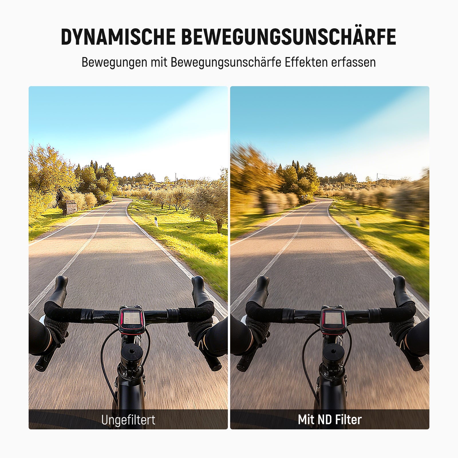 - Flexible Belichtungsbalance- Graufilter reduzieren das Licht um 3, 4, 5 bzw. 6 Stop, um eine Überbelichtung bei unterschiedlichen Lichtverhältnissen zu verhindern und Flüsse, Wasserfälle und Lichtspuren mit gleichmäßiger Bewegungsunschärfe einzufangen