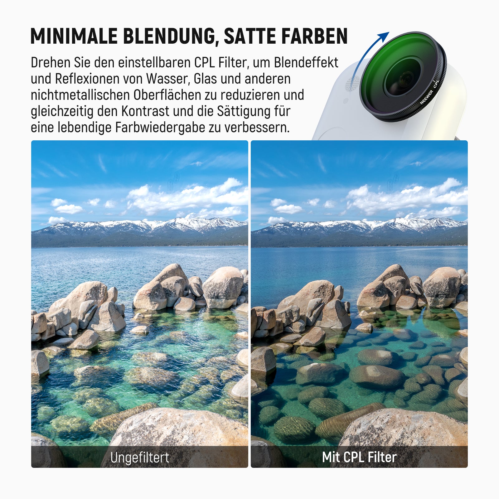 - Minimale Spiegelungen, satte Farben- Drehen Sie den einstellbaren Zirkular Polarisationsfilter, um Spiegelungen und Reflexionen von Wasser, Glas und anderen nichtmetallischen Oberflächen zu reduzieren und gleichzeitig den Kontrast sowie die Sättigung für eine lebendige Farbwiedergabe zu verbessern