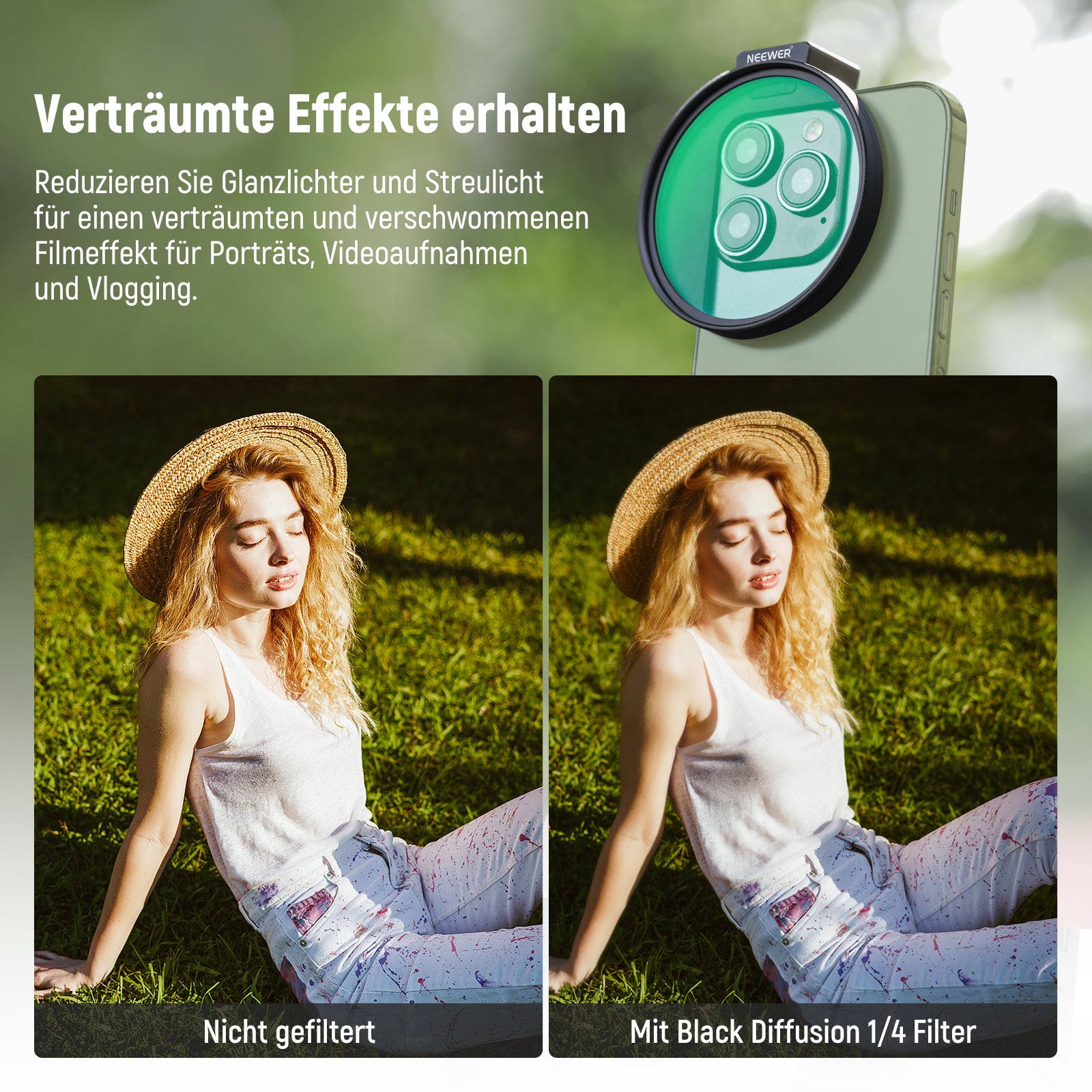 - Schwarzer Diffusions-Kameraobjektivfilter- Der NEEWER 67 mm schwarze Diffusionsfilter 1/4 erzeugt einen verträumten, kinoreifen Effekt, indem er Highlights reduziert und Blendung minimiert. Es glättet Hauttexturen und verleiht Ihren Bildern einen traurigeren, weicheren Ton. Dieser Filter verbessert den verschwommenen Filmeffekt, ideal für Porträtfotografie, Videoaufnahmen und Vlogs