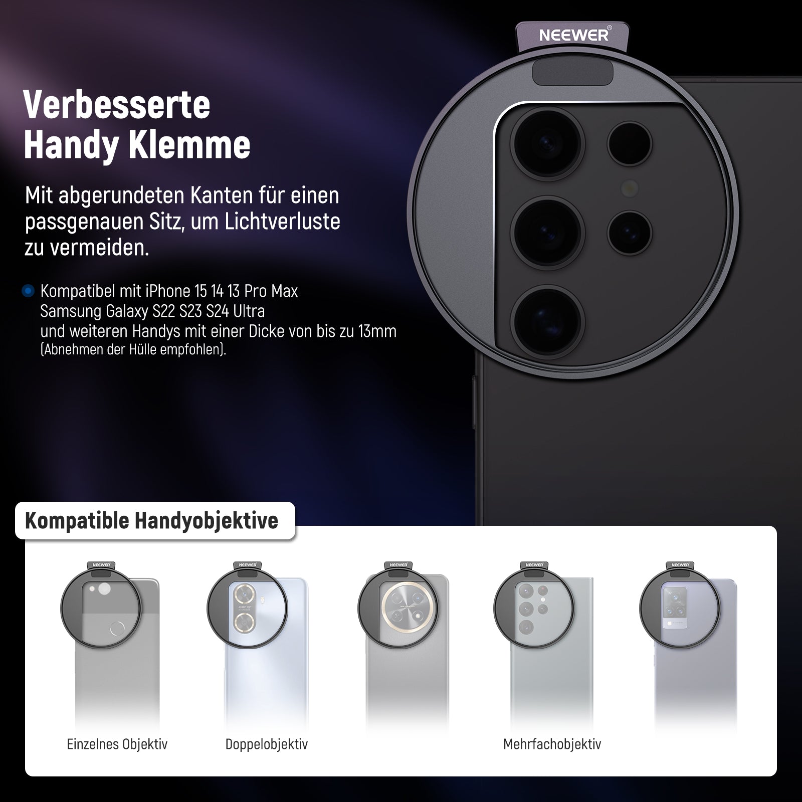 - Handy-Clip mit kaltem Schuh- Verbessertes Design, rechtwinkliger Handy-Clip passt eng an Smartphones und Tablets, kompatibel mit iPhone iPad, kompatibel mit Samsung Galaxy Note, kompatibel mit Huawei usw. 67 mm Filterdurchmesser ist geeignet für Einzelobjektiv-, Doppel- oder Dreifachlinsengeräte. Der eingebaute Kaltschuh kann verwendet werden, um LED-Videoleuchten, Mikrofone und anderes Zubehör zu montieren. Der Handy-Clip kann allein verwendet werden, kompatibel mit anderen Filtern, unterstützt das Stapeln von Filtern