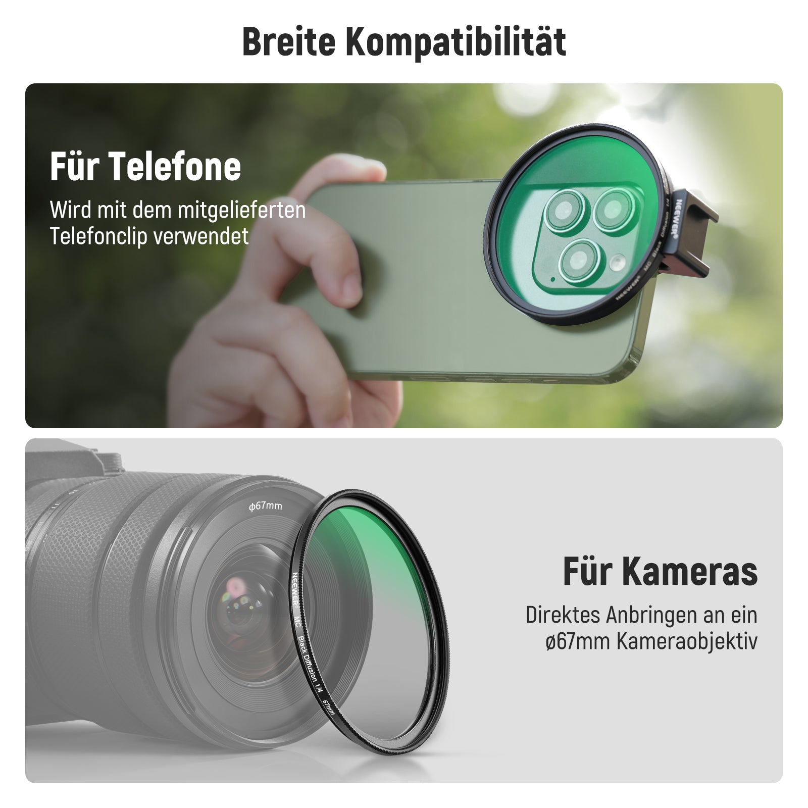 NEEWER FL-88 67 mm 1/4 schwarzer Diffusionsfilter & Kaltschuh-Handyclip für Handy