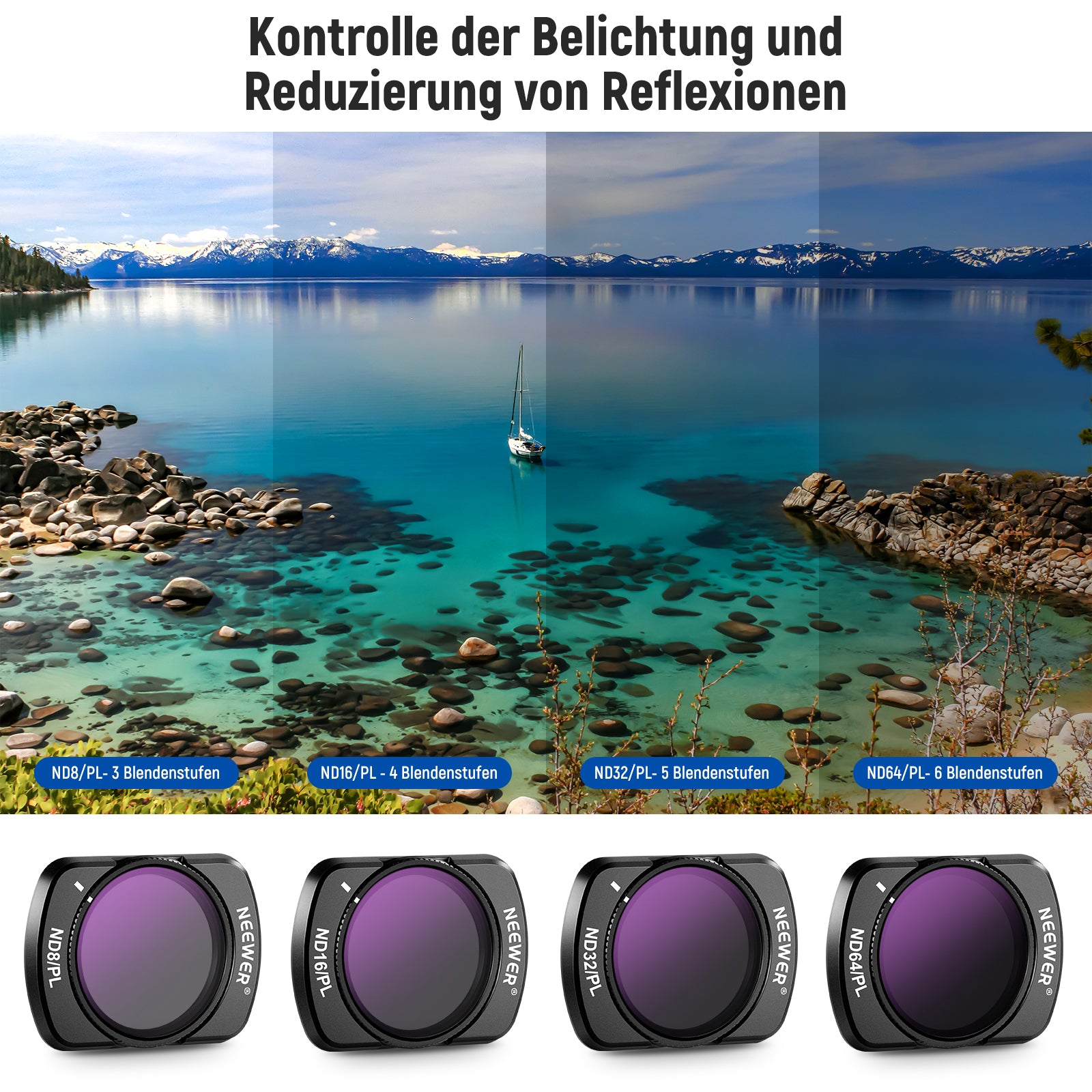 - Kombination aus ND und PL Filtern- Vier zirkulare ND Polfilter reduzieren das Licht um 3, 4, 5 und 6 Stops, um eine Überbelichtung in hellen Umgebungen zu vermeiden, und ermöglichen Ihnen die Aufnahme dynamischer Bewegungsunschärfe durch Verwendung langsamer Verschlusszeiten und großer Blendenöffnungen. Außerdem können ihre polarisierenden Effekte Reflexionen und Blendung auf nicht metallischen Oberflächen eliminieren und gleichzeitig die Farbsättigung und den Kontrast erhöhen