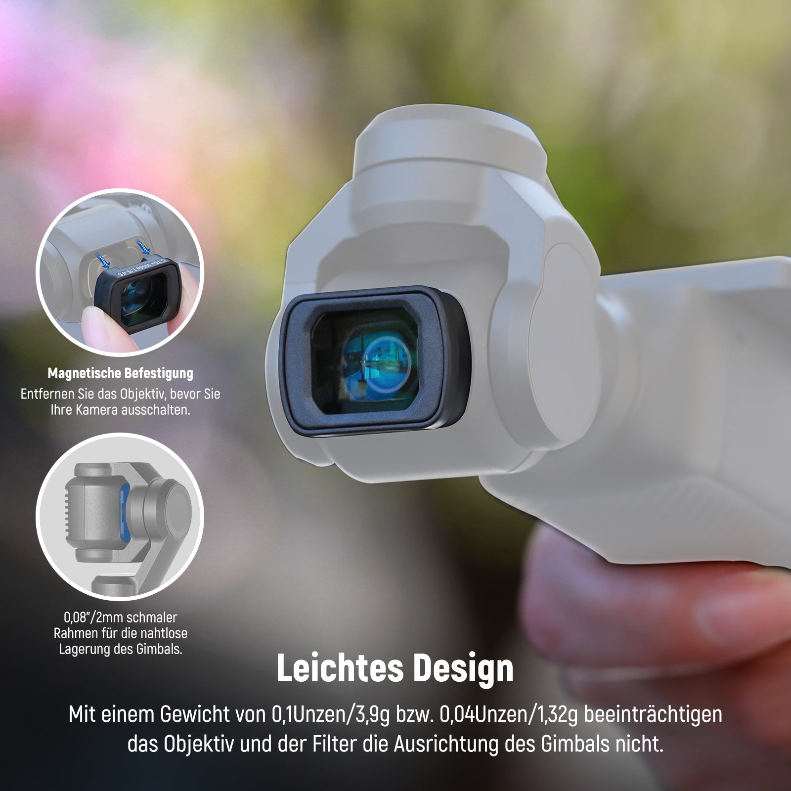 - Beim Anbringen am Pocket 3 kann das Weitwinkelobjektiv nicht gleichzeitig mit ND-, CPL- oder anderen Filtern verwendet werden.