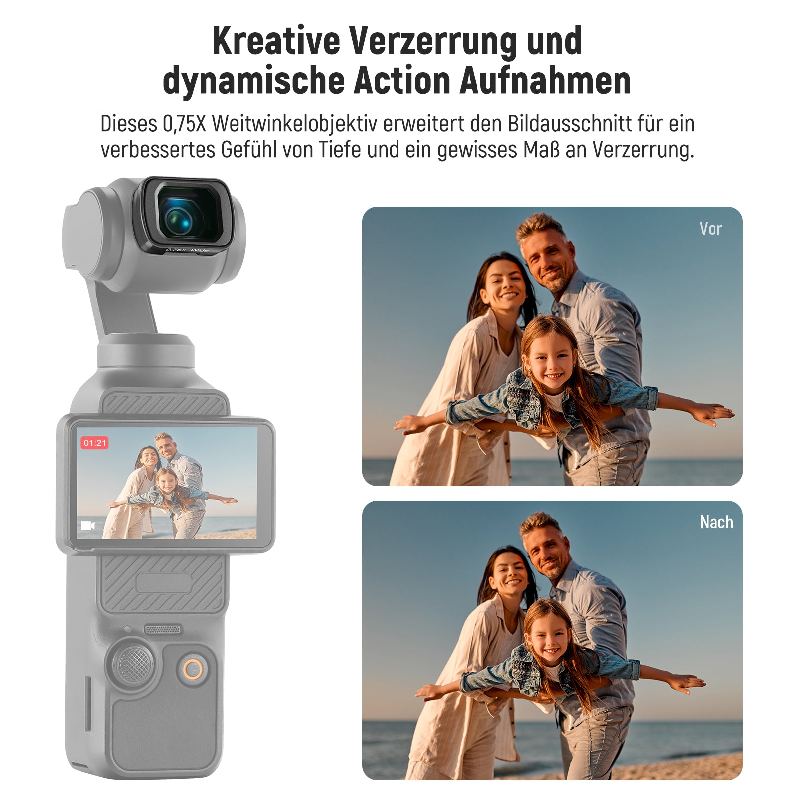 - Asphärisches 0,75X Weitwinkelobjektiv- Das 0,75X Weitwinkelobjektiv kann das Sichtfeld (FOV) auf 108° erweitern und einen leicht verzerrten Effekt für kreative Aufnahmen erzeugen, perfekt für Landschaftsfotografie, Straßenfotografie und Gruppenporträts. Die hochgradig durchlässige asphärische Linsen Konstruktion sorgt für außergewöhnliche Klarheit. Hinweis: Entfernen Sie das Objektiv, bevor Sie den Gimbal aufbewahren. Stapeln Sie das Objektiv und die Filter nicht