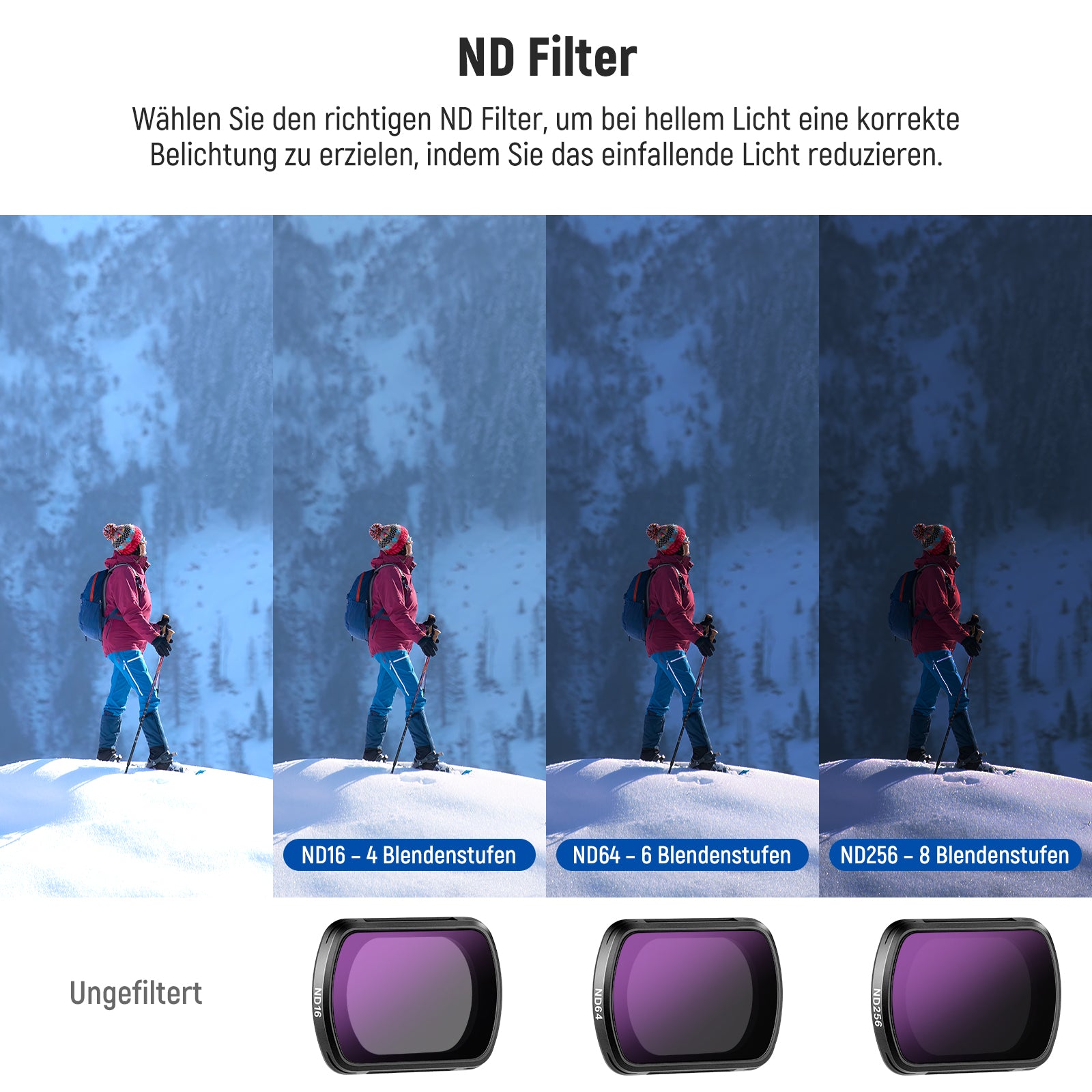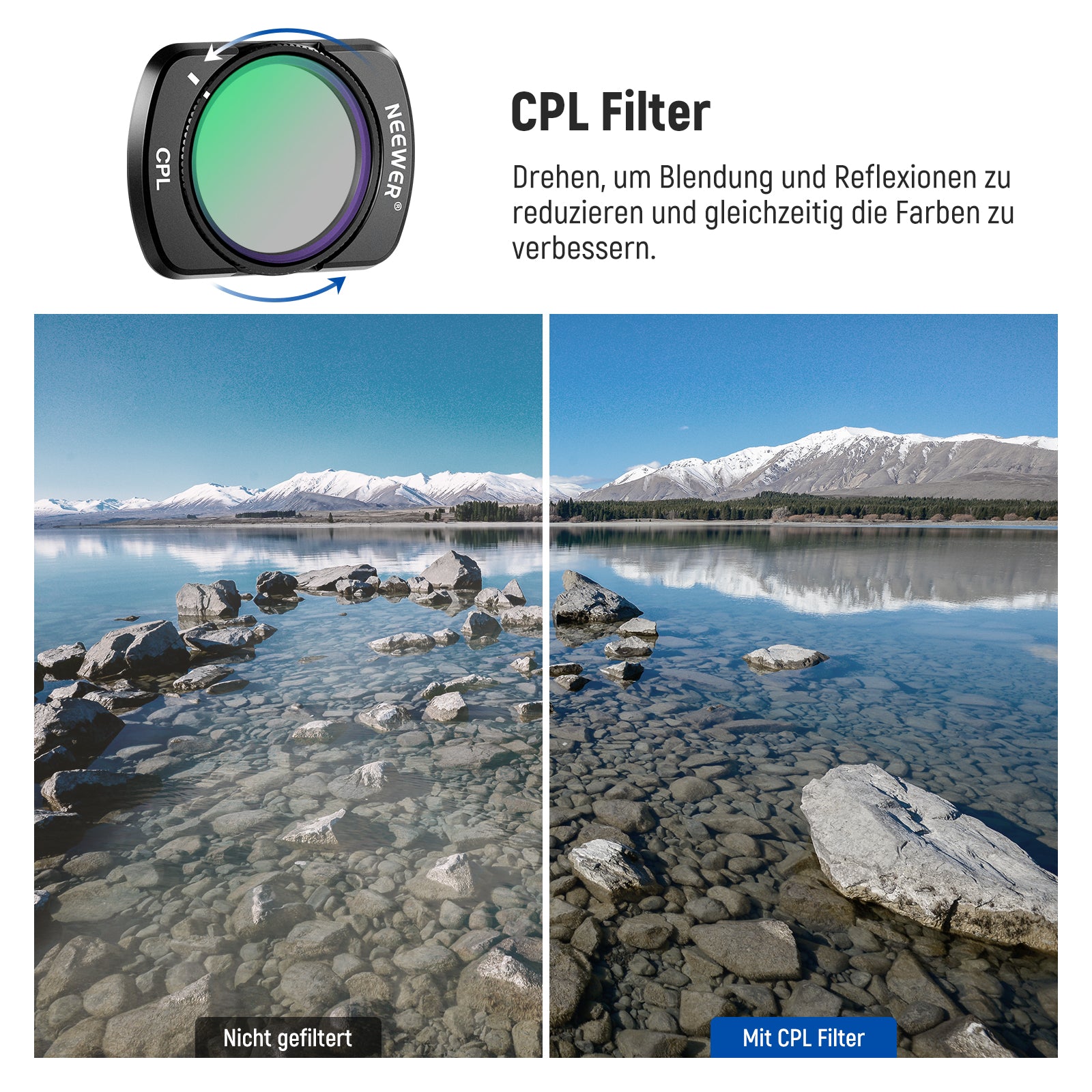 - Ausgleich der Belichtung und Verbesserung der Farben- Drei ND Filter reduzieren das Licht um 4, 6 und 8 Stops, um eine Überbelichtung in hellen Umgebungen zu vermeiden, und ermöglichen Ihnen die Aufnahme dynamischer Bewegungsunschärfe durch die Verwendung langsamer Verschlusszeiten und großer Blendenöffnungen. Der CPL Filter eliminiert Reflexionen auf Wasser, Glas und nicht metallischen Oberflächen und erhöht gleichzeitig den Kontrast und die Sättigung