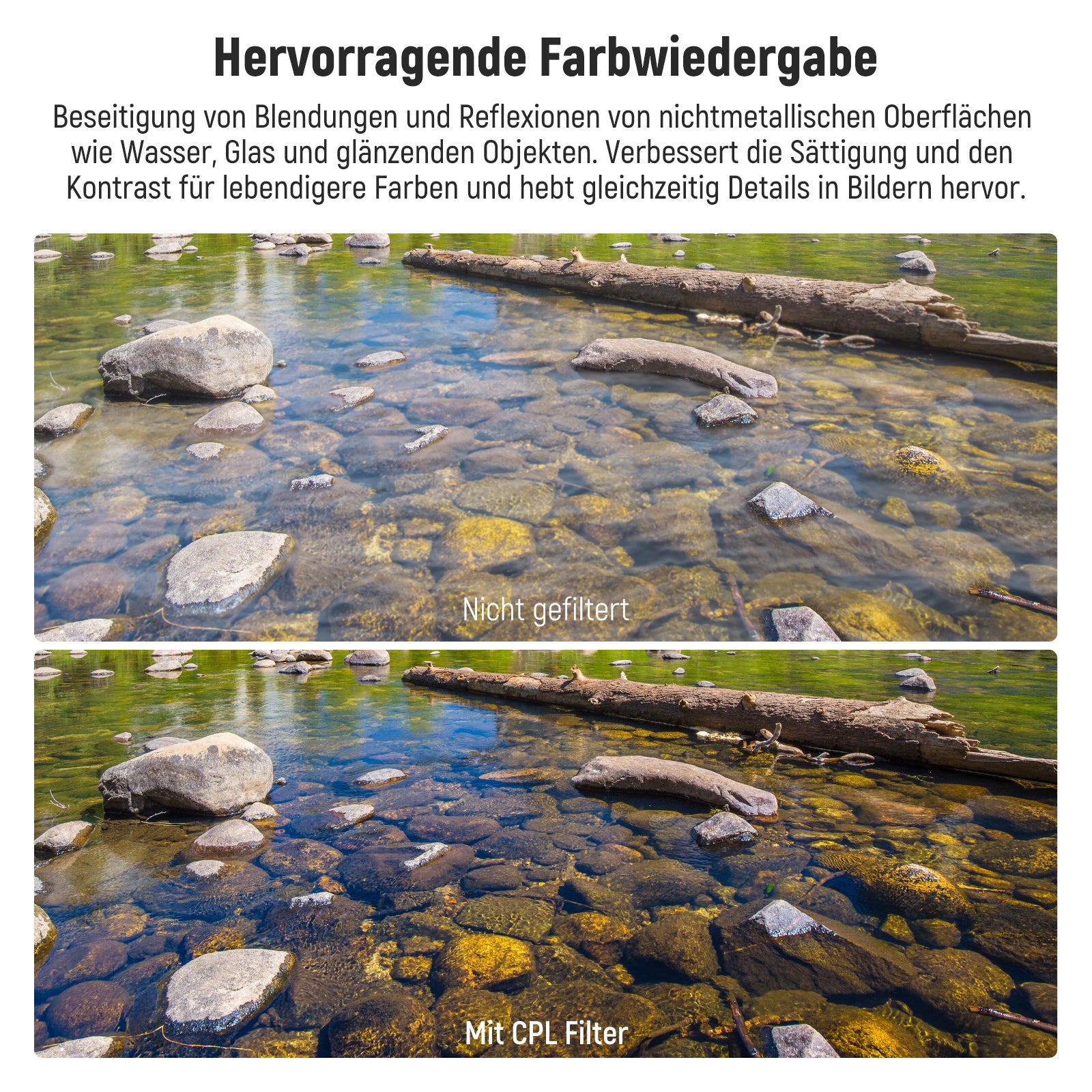 - Reduziert unerwünschte Reflexionen- Beseitigt Blendung und Reflexionen von nichtmetallischen Oberflächen wie Wasser, Glas und glänzenden Objekten