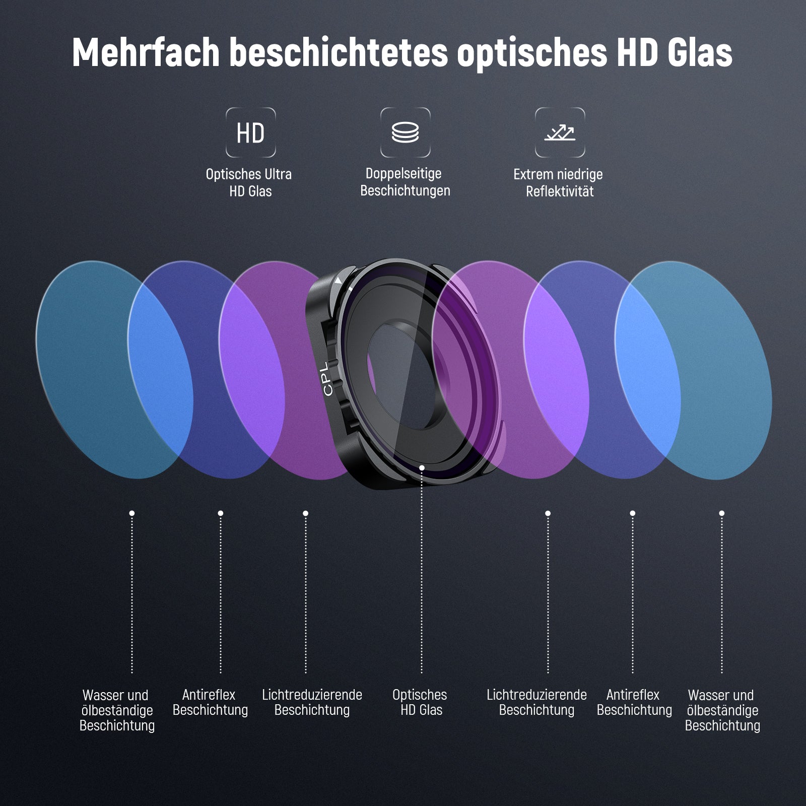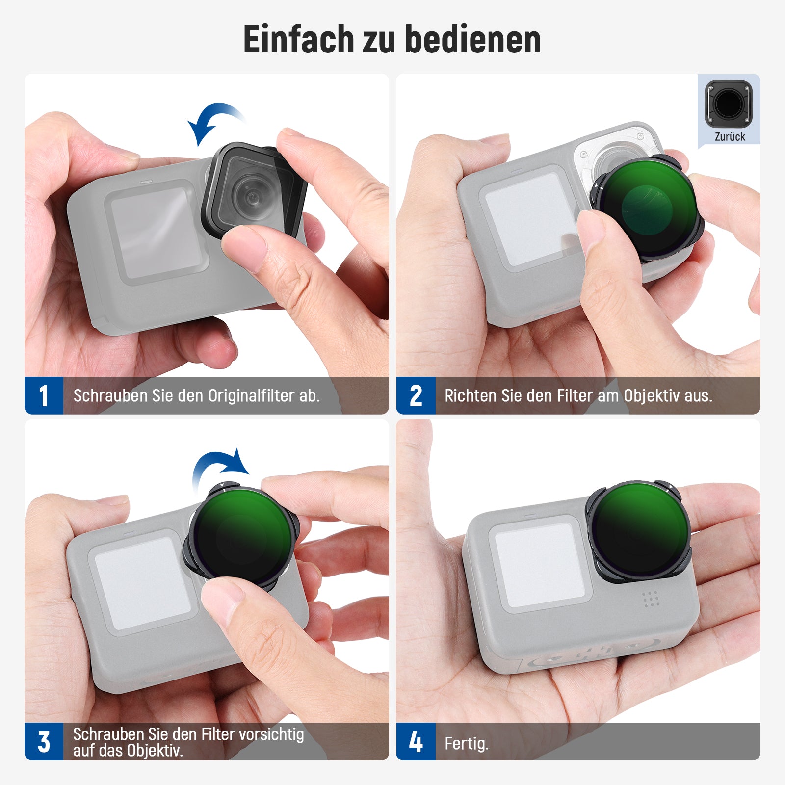 Hinweis: Objektiv 、CPL &ND/PL Filter obwohl der Filter eine wasserdichte Beschichtung hat, kann die gesamte Action Kamera nicht unter Wasser verwendet werden