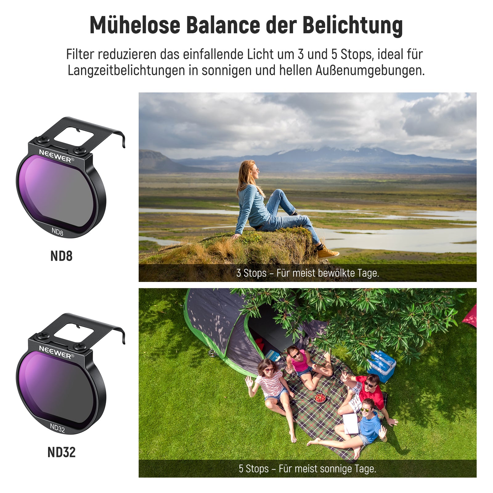 - Mühelose Balance der Belichtung- ND8 und ND32 Filter reduzieren das Licht um 3 bzw. 5 Stops und eignen sich für Langzeitbelichtungsaufnahmen bei hellen Außenbedingungen. Sie ermöglichen es Ihnen, mit längeren Verschlusszeiten und größeren Blendenöffnungen zu fotografieren und Bewegungen mit ausdrucksstarken Bewegungsunschärfe Effekten einzufangen