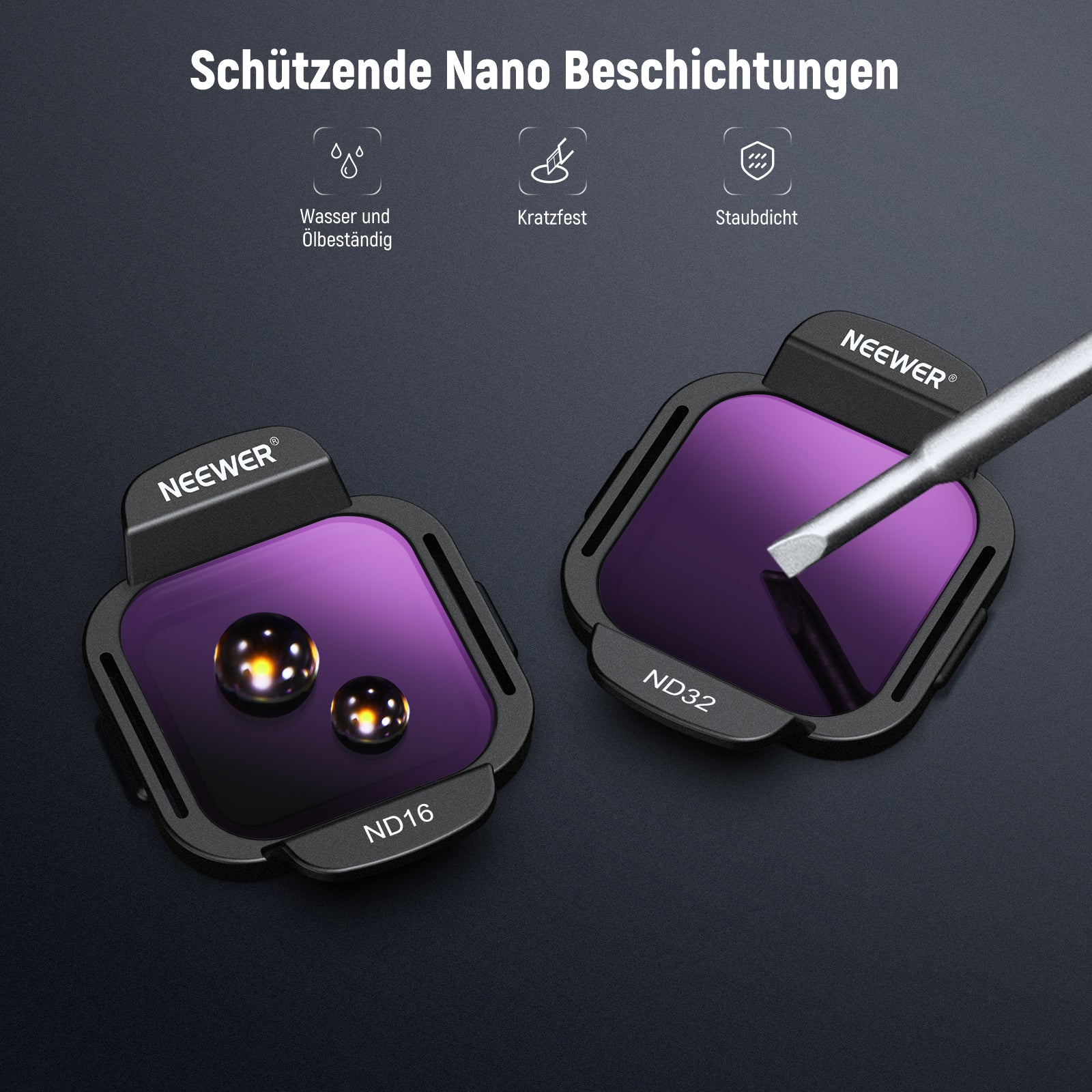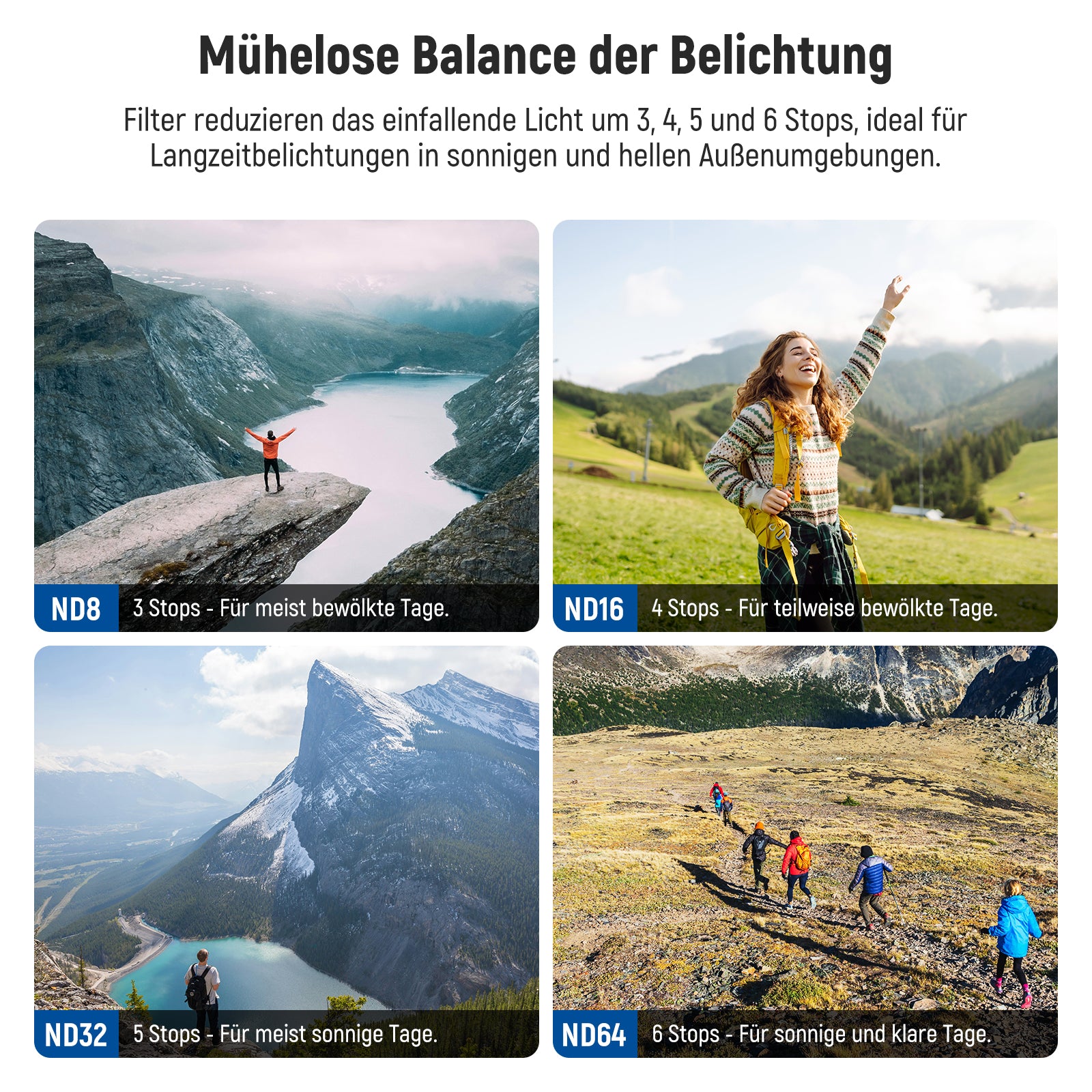- Mühelose Balance der Belichtung- Die Filter ND8, ND16, ND32 und ND64 reduzieren das Licht um 3, 4, 5 bzw. 6 Stops und eignen sich für Langzeitbelichtungen bei hellen Außenbedingungen. Sie ermöglichen es Ihnen, mit längeren Verschlusszeiten und größeren Blendenöffnungen zu fotografieren und Bewegungen mit ausdrucksstarken Bewegungsunschärfe Effekten einzufangen