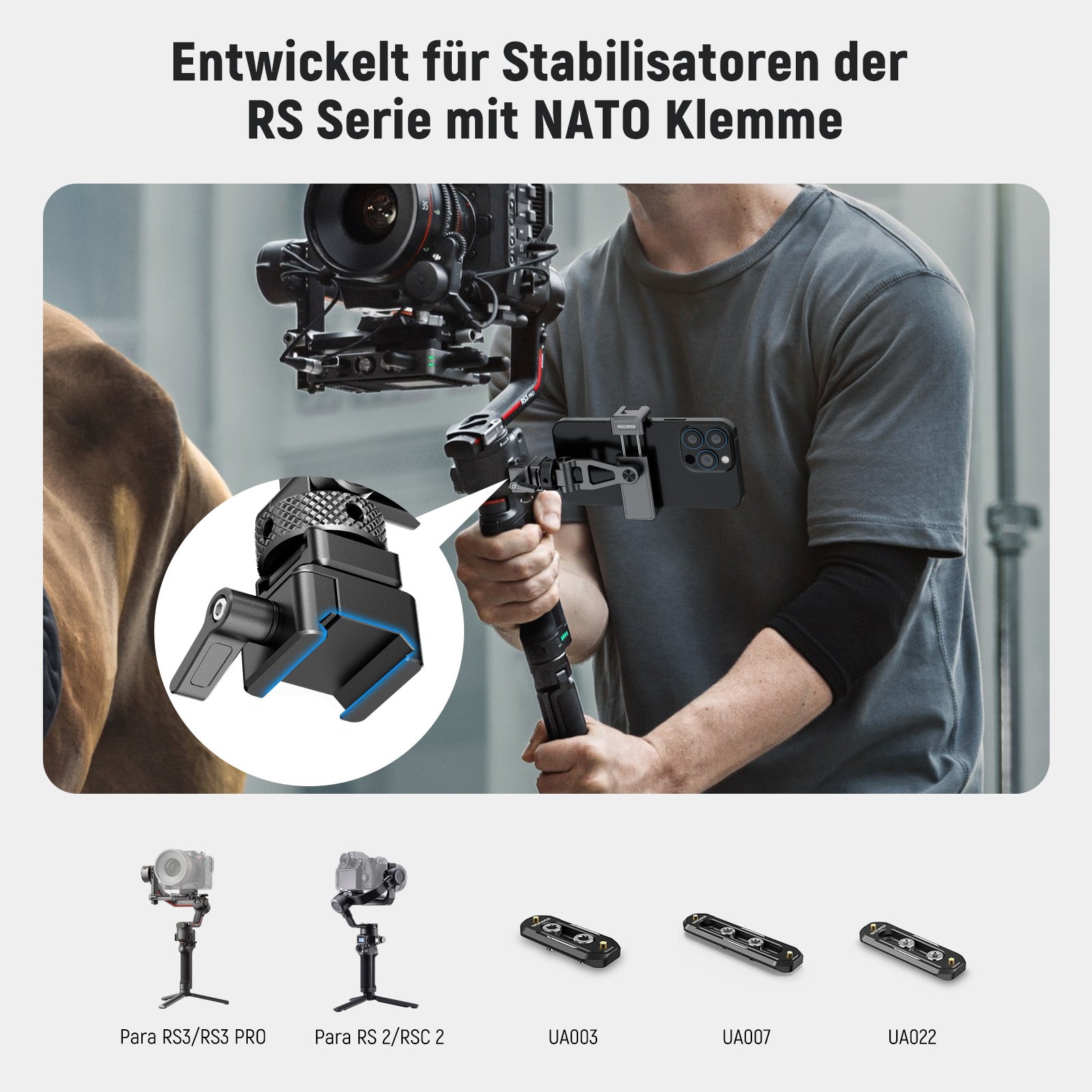 - 【Entwickelt für Stabilisatoren der RS Serie mit NATO Klemme】Handyhalterung mit dem abnehmbaren NATO Klemme können Sie diese Telefonkamerahalterung an einem Gimbal Stabilisator befestigen, um eine reibungslose Verfolgung und sogar Überwachung (Drittanbietern Apps) zu ermöglichen. Der Smartphone Halterung ist kompatibel mit DJI RS 3 RS 3 4 PRO RS 2 RSC 2. Sie können den Telefonhalter auch an Kamerakäfigen mit NATO Schienen (NEEWER UA003 UA007 UA022) montieren, kompatibel mit SmallRig Zubehör