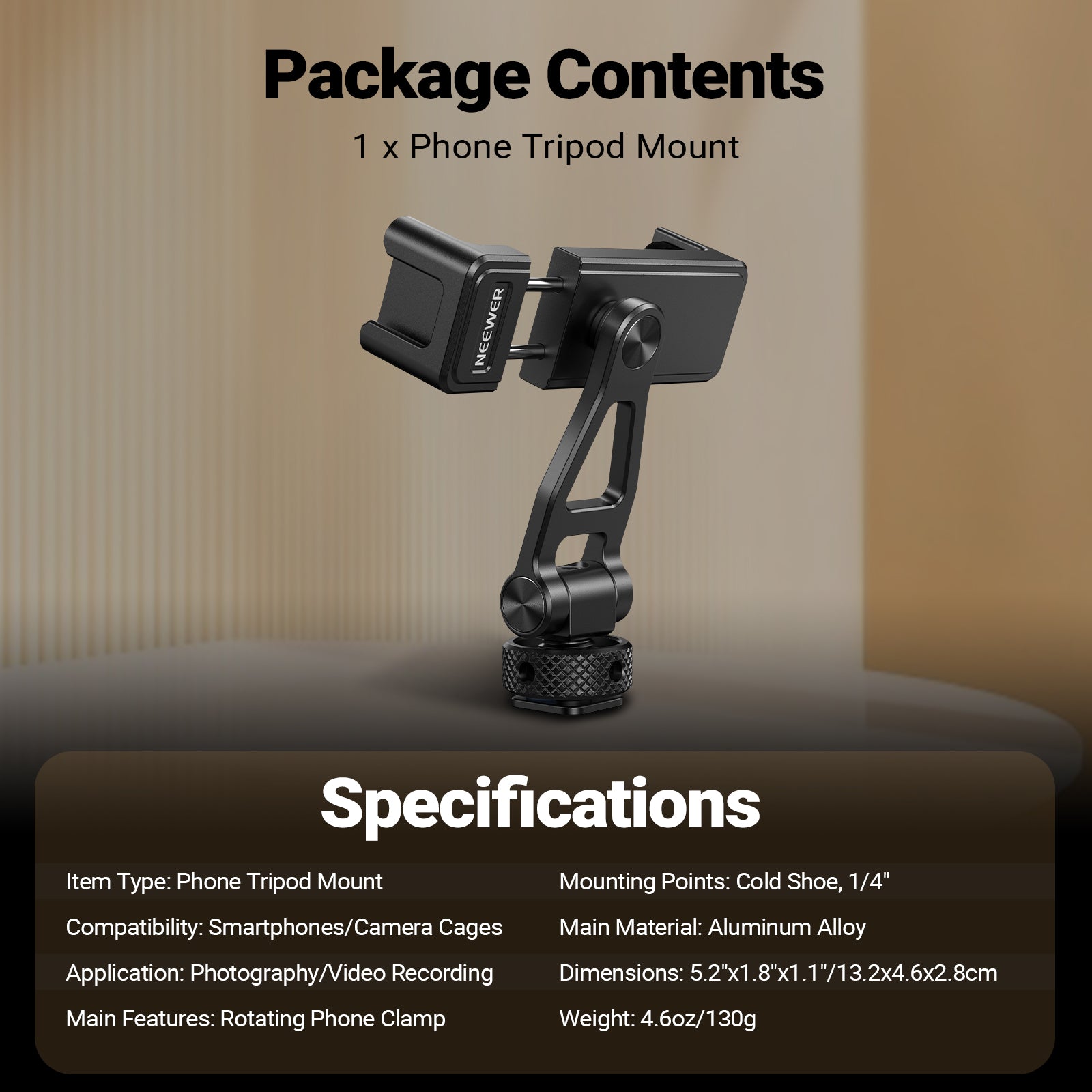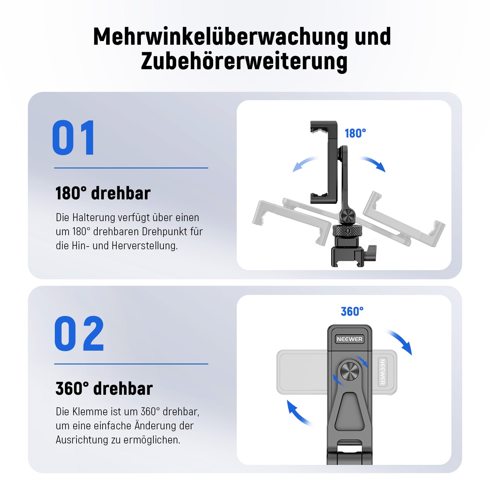 - 【Mehrwinkelüberwachung und Zubehörerweiterung】 Der Handy Klemmhalter ist um 360° drehbar für einfache vertikale und horizontale Wechsel, und der Metall Stativhalterung verfügt über einen um 180° drehbaren Drehpunkt und Handy Stativ Adapter kann nach vorne und Herverstellungen, ideal für Überkopf, Aufwärtsbewegungen und Vertikalaufnahmewinkel. Auf beiden Seiten der Klemme befindet sich eine Cold Shoe Halterung für LED Videoleuchten, RGB Leuchten, Mikrofone usw