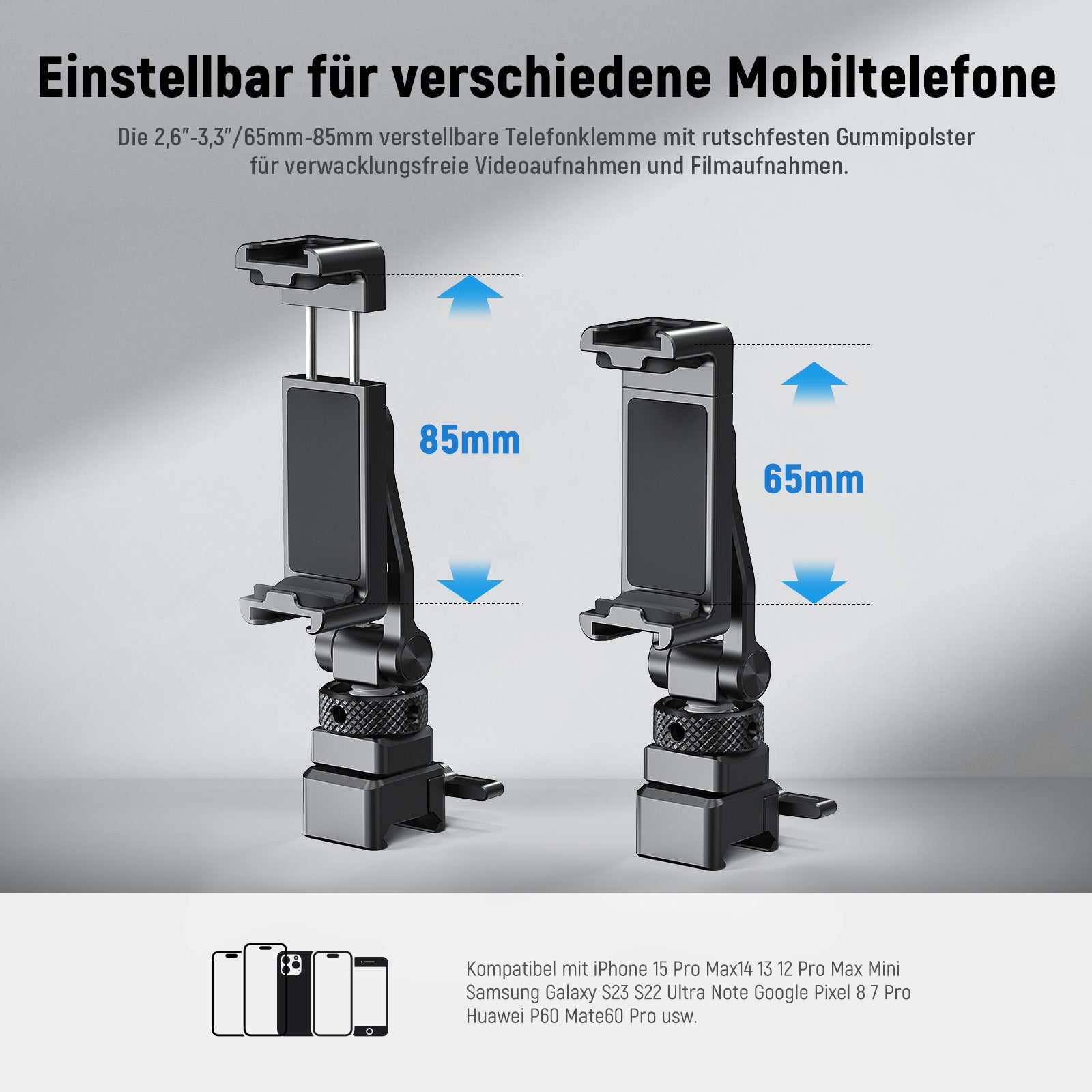- 【Universal Handy Käfig Vlogging Set】 Mit einem 2,2"-4"/56-101,5mm verstellbaren Telefonhalter ist dieses Telefon Video Rig mit iPhone 16 15 Pro Max 15 14 13 12 Samsung Galaxy S24 Ultra S23 Pixel 8 Pro und anderen Handys kompatibel. Der Telefonhalter ist seitlich verschiebbar und verfügt an beiden Enden über Haken, um ein Herunterfallen Ihres Telefons zu verhindern