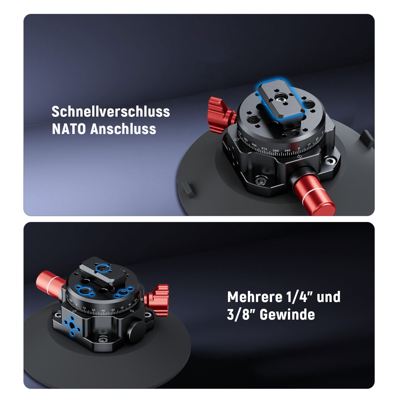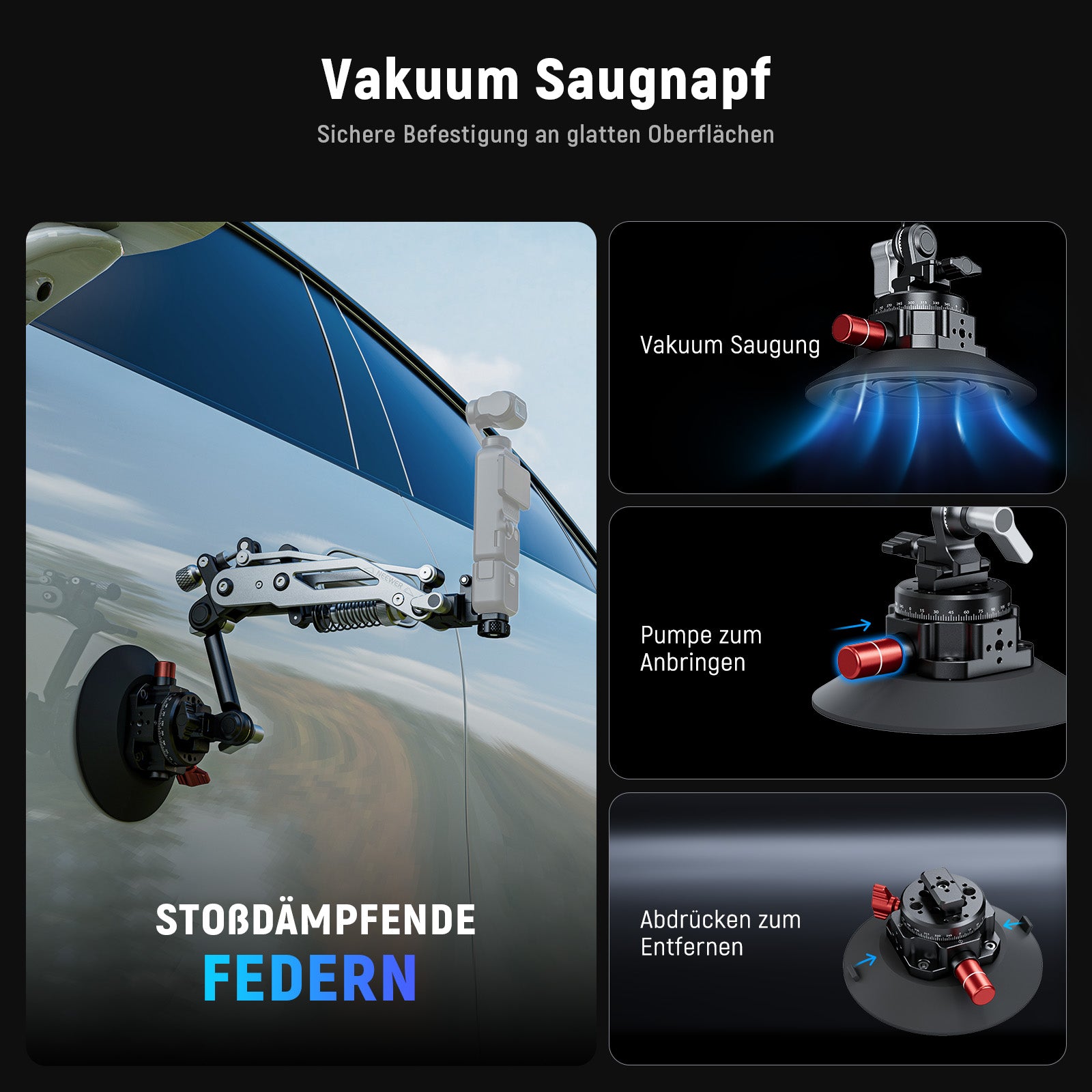 - Sicherer Vakuum Autosaugnapf- Der Saugnapf mit Vakuumpumpe sorgt für eine sichere Befestigung auf glatten Oberflächen wie Motorhauben und Windschutzscheiben und bietet stabilen Halt für Ihr Equipment bei Aufnahmen in Bewegung. Die 360°-Schwenkbasis ermöglicht eine gleichmäßige und kontinuierliche Drehung für Panoramaaufnahmen. Hinweis: Bitte reinigen Sie den Saugnapf und die Kontaktfläche vor dem Gebrauch gründlich und stellen Sie sicher, dass alle Schrauben fest angezogen sind. Verwenden Sie das Produkt nur bei Geschwindigkeiten unter 80 km/h, um ein versehentliches Herunterfallen zu vermeiden.